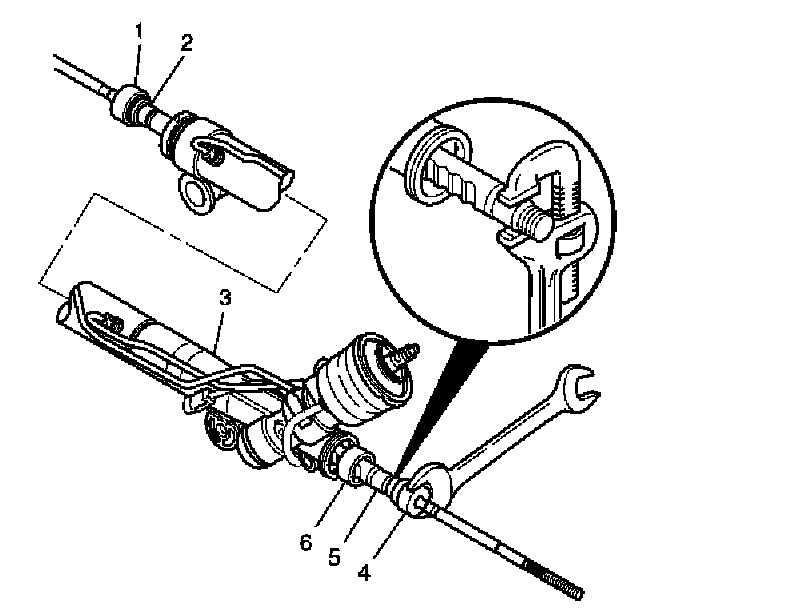 6. Place a wrench on the flats of the inner tie rod housing (4).