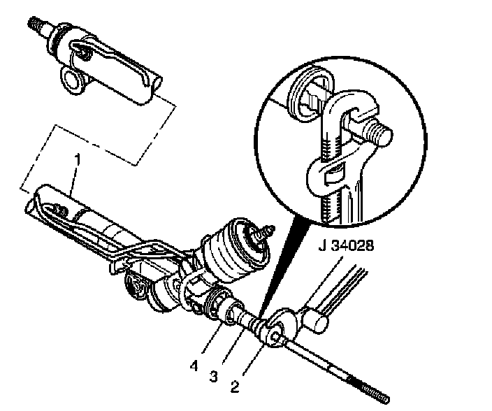 5. Place a torque wrench and J 34028 on the flats of the inner tie rod housing (2).