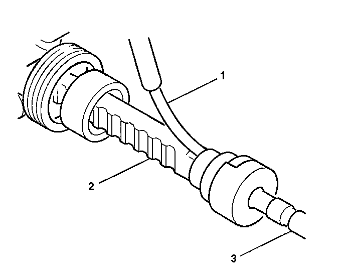 14. Slide the shock dampener (2) over the inner tie rod housing (3) until the front lip of the shock dampener (2) bottoms against the inner tie rod housing (3).