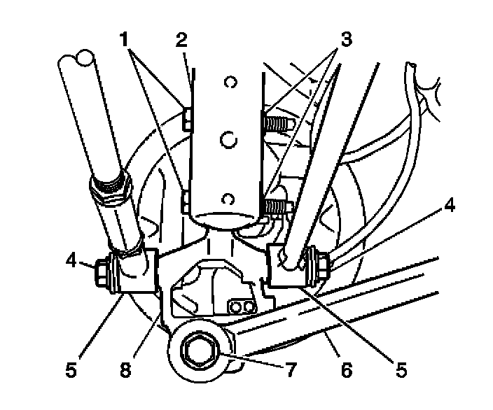 4. Install the bolt and nut to the trailing arm (6) and the knuckle (8).