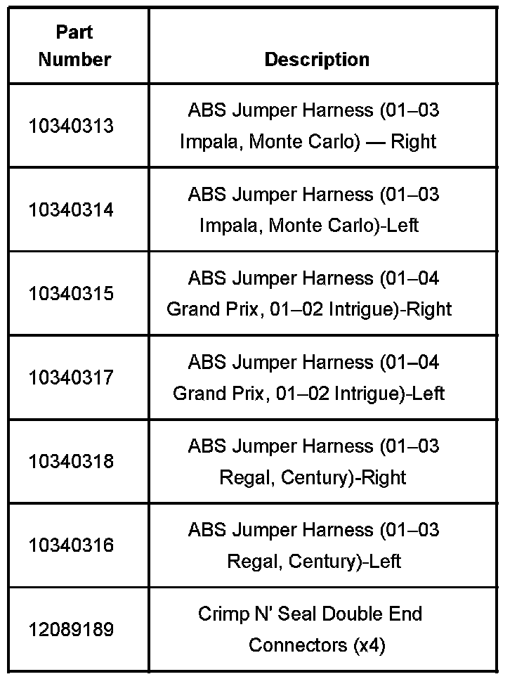 Replace original wheel speed sensor harnesses by splicing in revised wheel speed sensor harnesses. The new design harnesses are of a different length and have revised retention clip locations. Use the following procedure to replace the harnesses.
