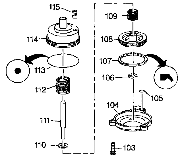 3. Remove the servo piston assembly (106-111), the servo piston spring (112) and the servo exhaust screen (115) from the servo piston cylinder (114).