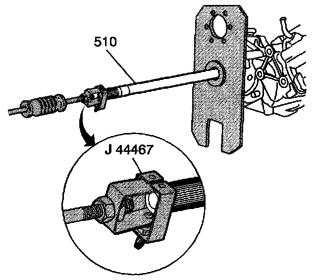 15. Attach the J 6125-1B to J 44467. Install the J 44467 into the snap ring groove on the output shaft (510). Tighten J 44467 securely to the output shaft.