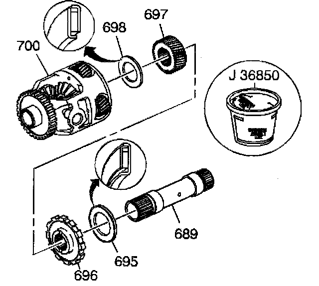 1. Assemble the carrier/sun gear thrust bearing (698), the final drive sun gear (697) with the chamfered side toward the parking gear (696) into the differential/final drive carrier assembly (700).