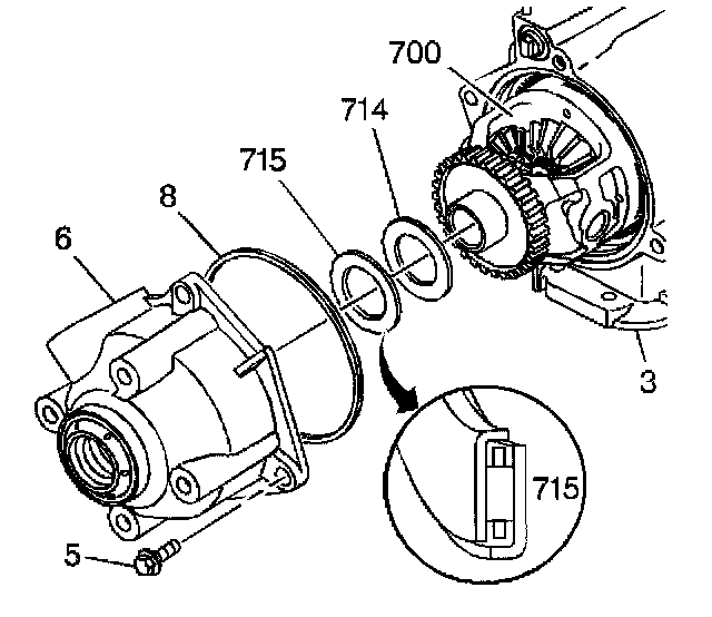 3. Install the thrust bearing (715) onto the differential/final drive carrier assembly (700).
