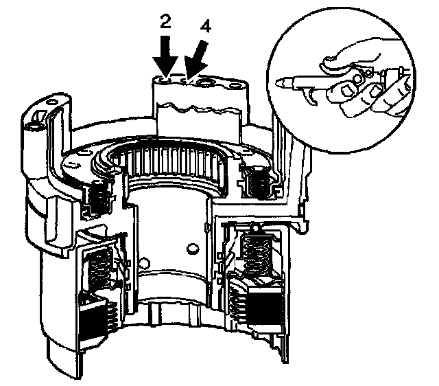2. Apply 138 kPa (20 psi) to the feed holes marked 2 and 4, and listen for the second and fourth clutches to apply.