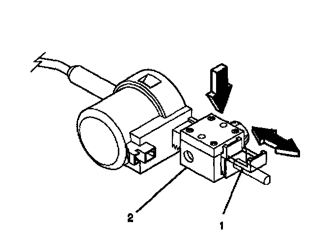 ^ Pull out the tab (1) on the adjuster block side (2) of the actuator.