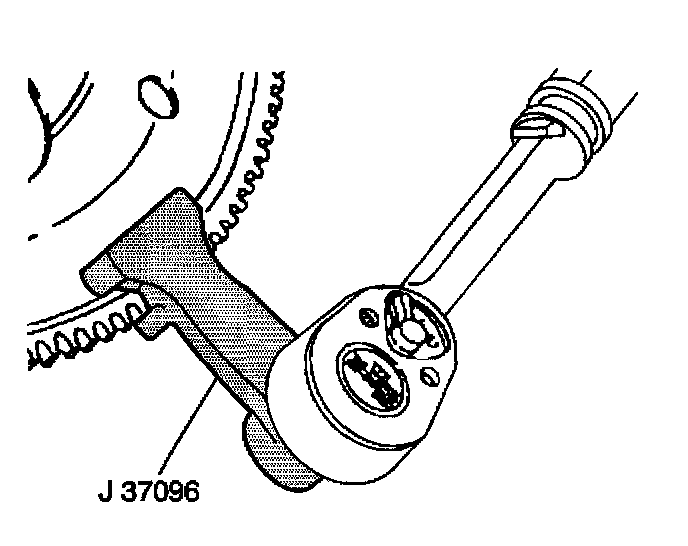 4. Install the J 37096 in order to gain access to the torque converter bolts and to prevent the flywheel from turning.