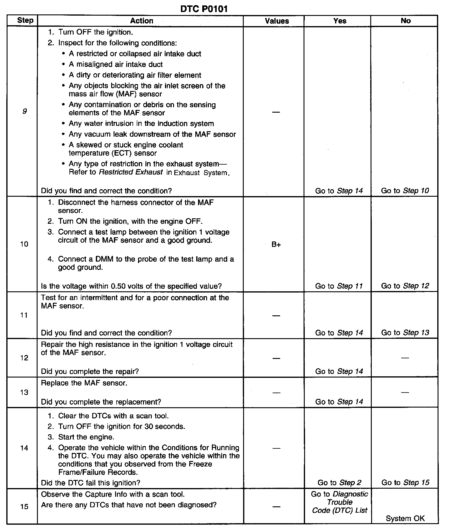 The PCM compares the actual MAF sensor frequency signal to the predicted MAF value. This comparison will determine if the signal is stuck based on a lack of variation, or is too low or too high for a given operating condition. If the PCM detects the actual MAF sensor frequency signal is not within a predetermined range of the calculated MAF value, DTC P0101 sets.