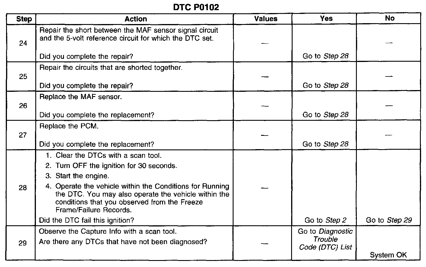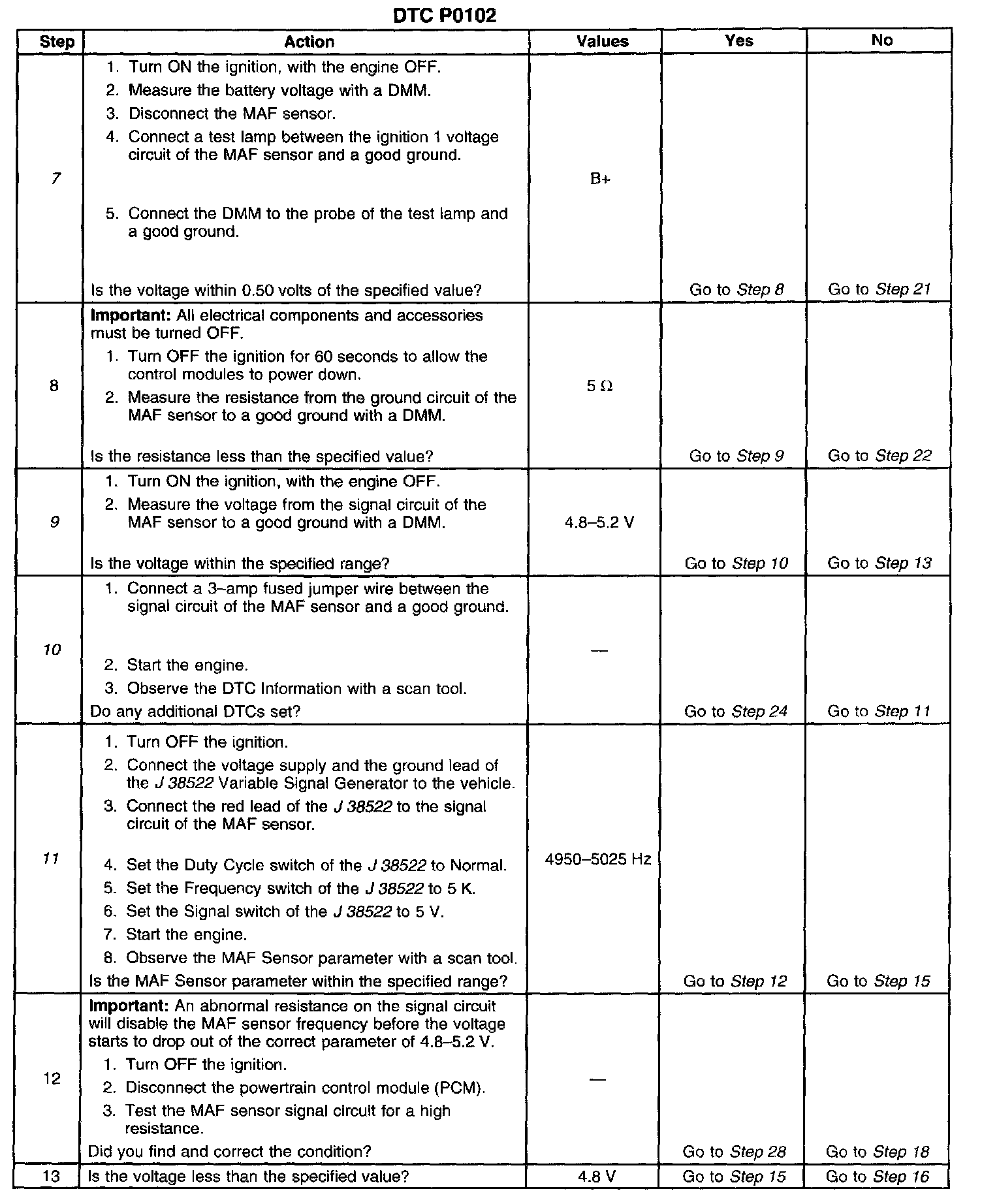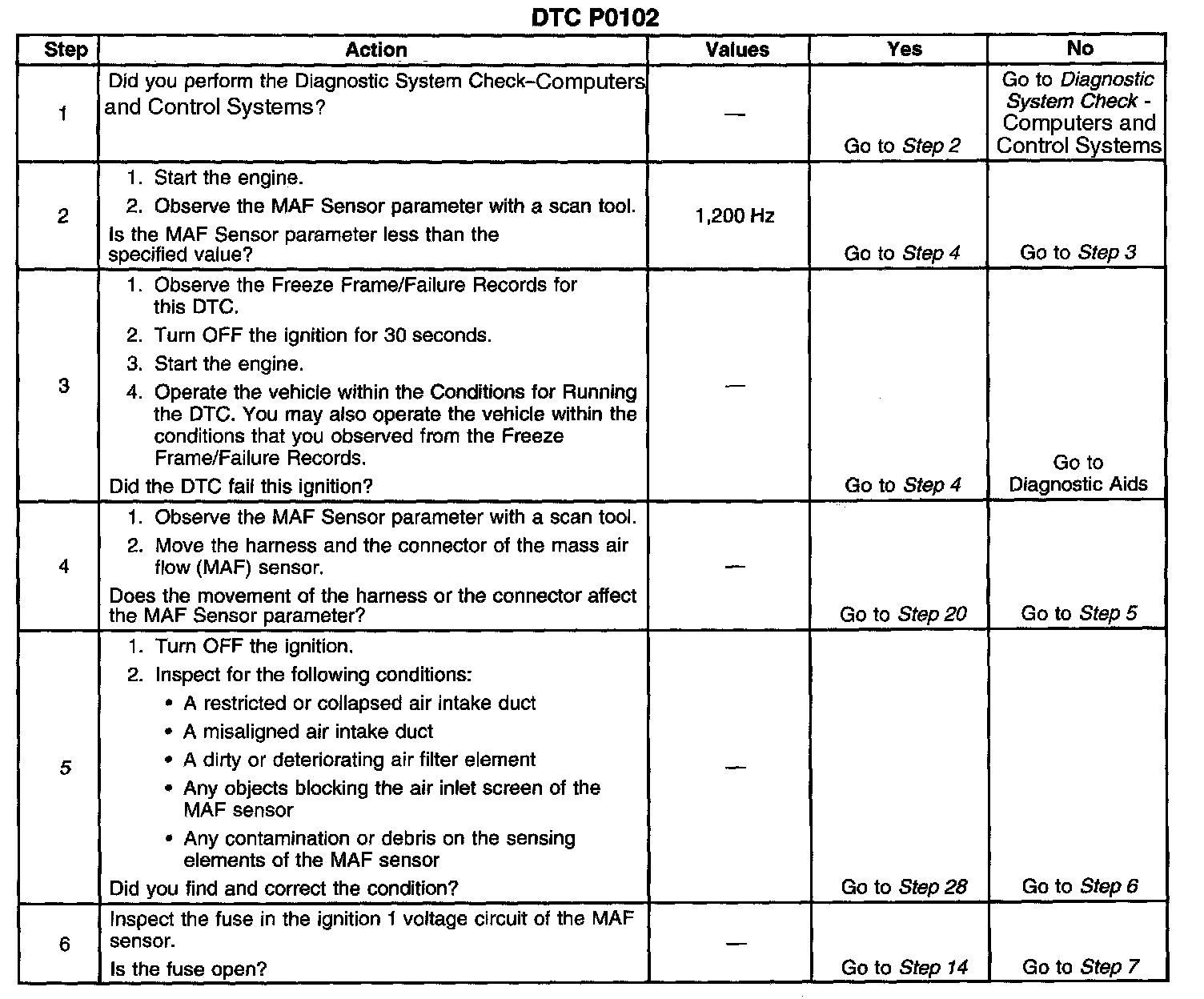 The PCM applies a voltage to the sensor on the signal circuit. The sensor uses the voltage to produce a frequency based on the inlet air flow through the sensor bore. The frequency varies within a range of near 2,000 Hertz at idle to near 10,000 Hertz at maximum engine load. If the PCM detects the frequency signal is less than the possible range of a correctly operating MAF sensor DTC P0102 sets.