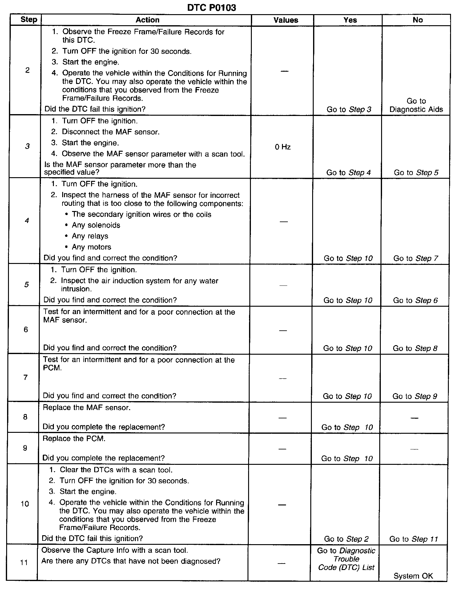 The PCM applies a voltage to the sensor on the signal circuit. The sensor uses the voltage to produce a frequency based on the inlet air flow through the sensor bore. The frequency varies within a range of near 2,000 Hertz at idle to near 10,000 Hertz at maximum engine load. If the PCM detects a frequency signal more than the possible range of a correctly operating MAF sensor DTC P0103 sets.