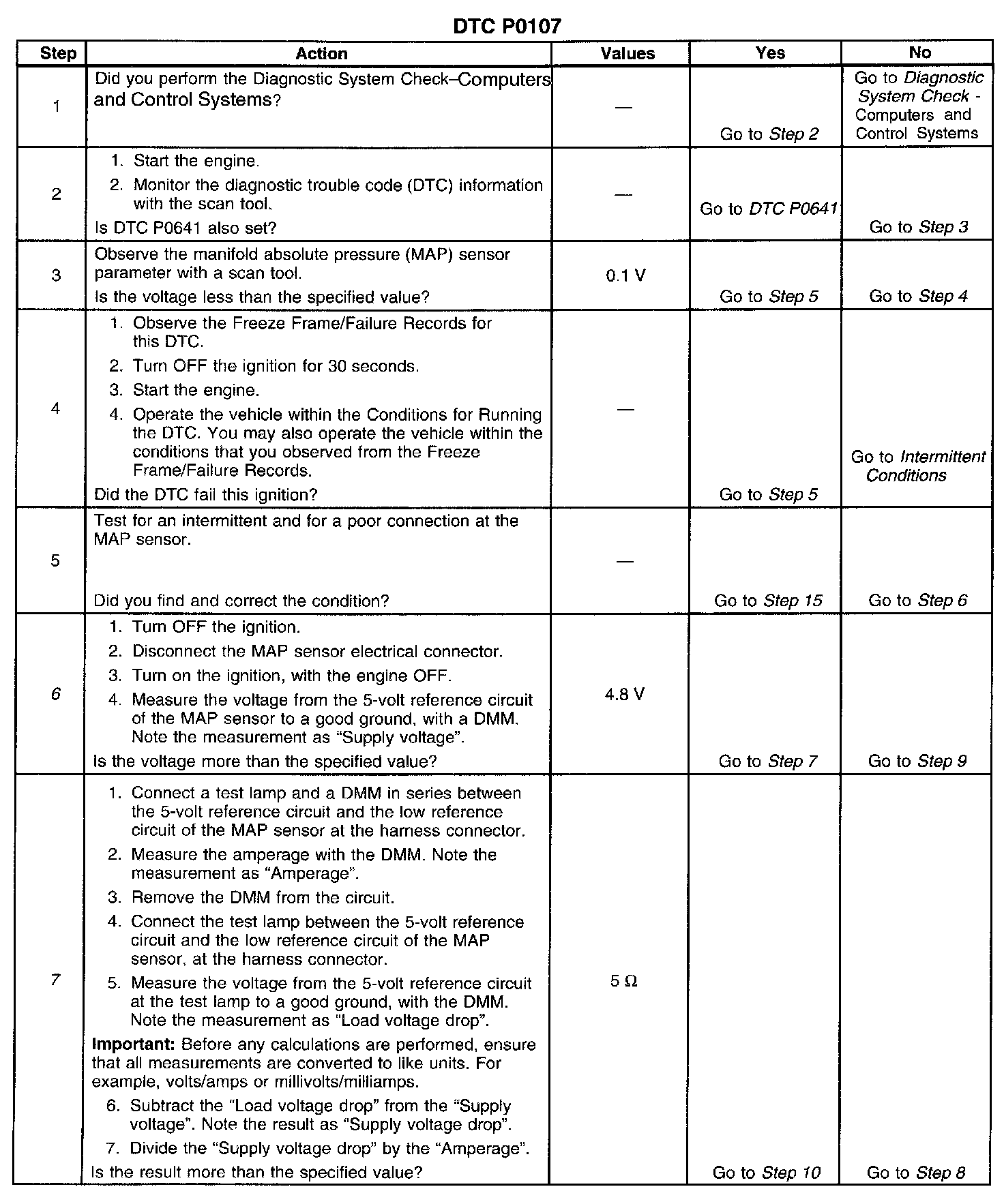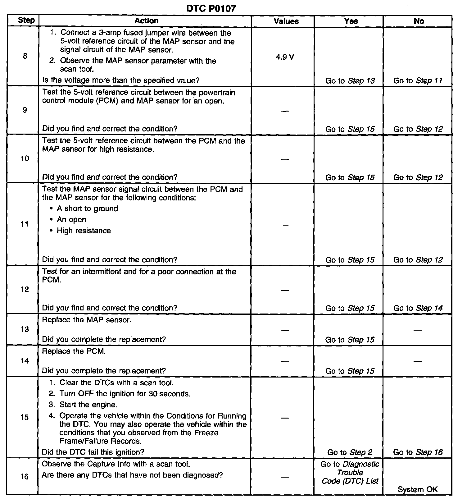 If the PCM detects a MAP sensor signal voltage that is excessively low, DTC P0107 will set.