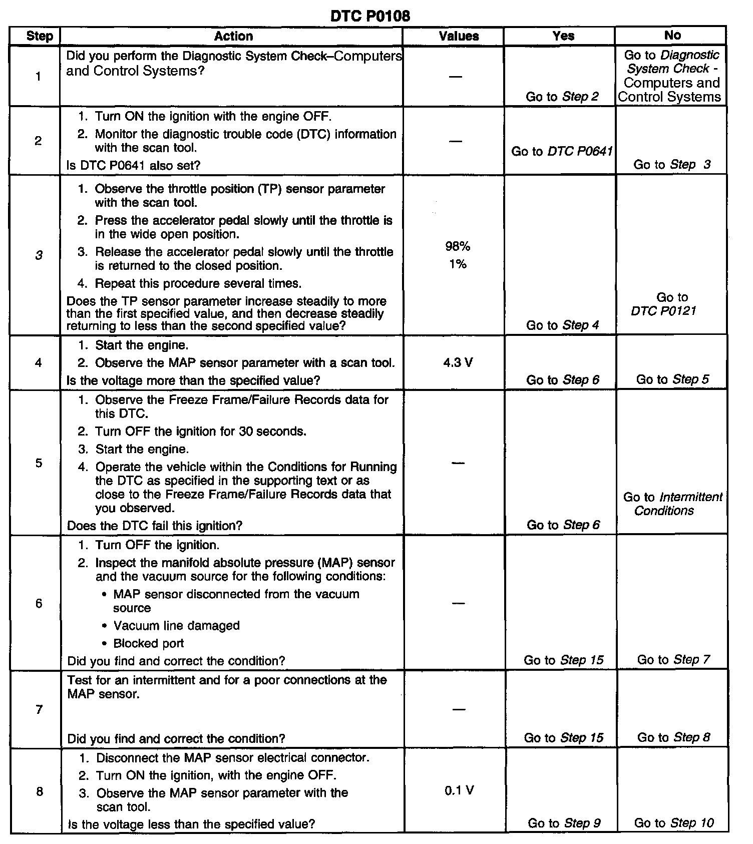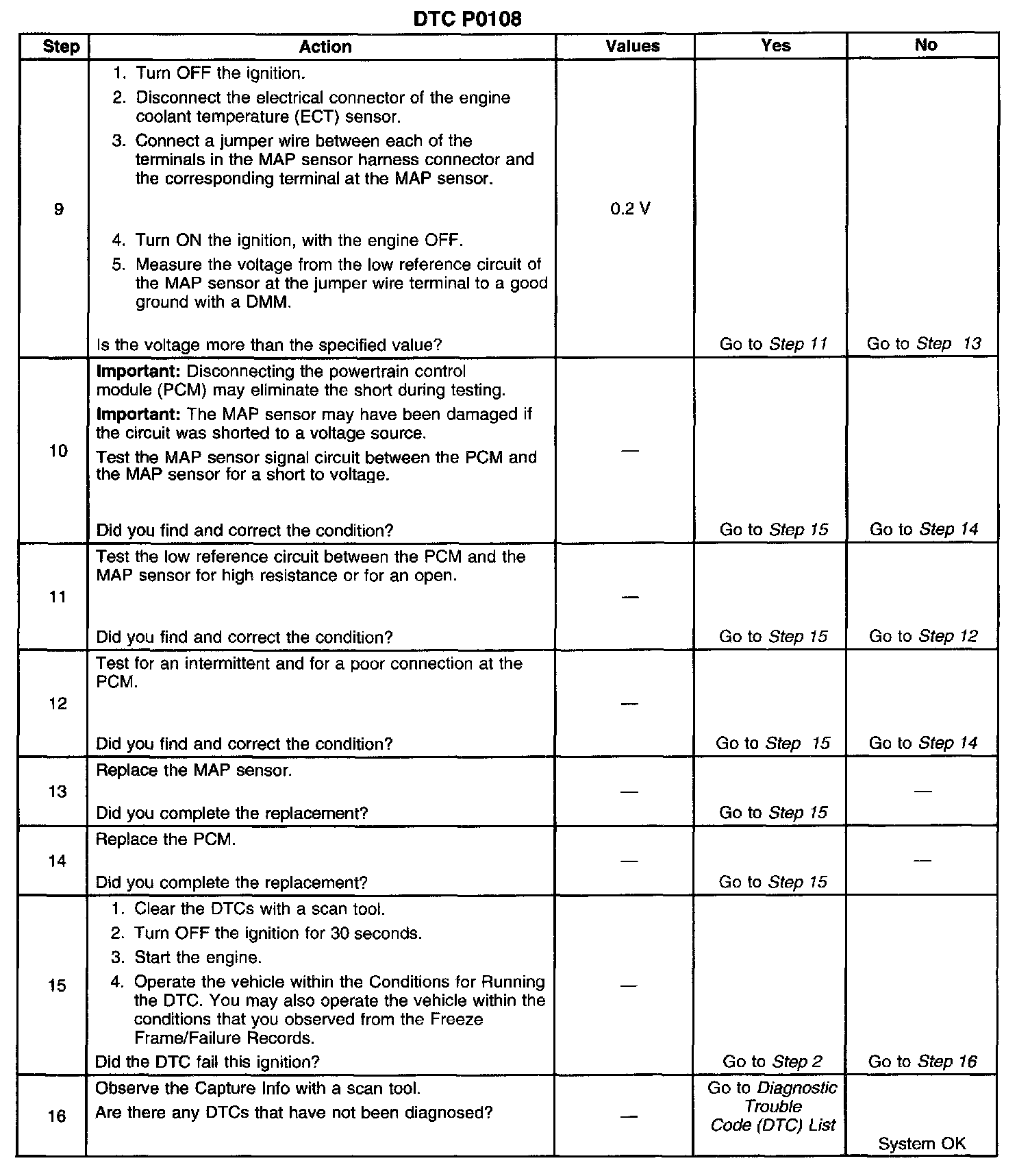 If the PCM detects a MAP sensor signal voltage that is excessively high, DTC P0108 sets.