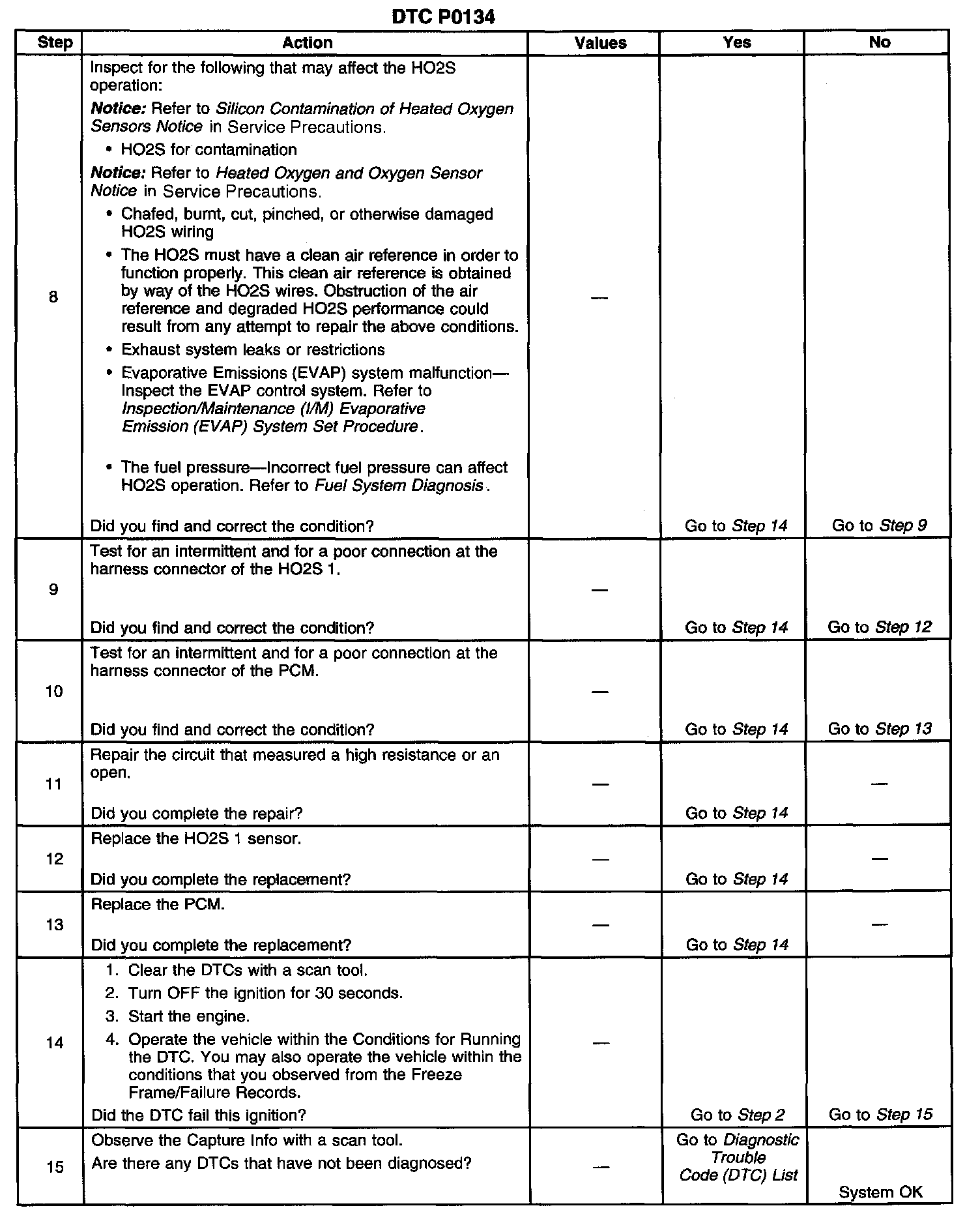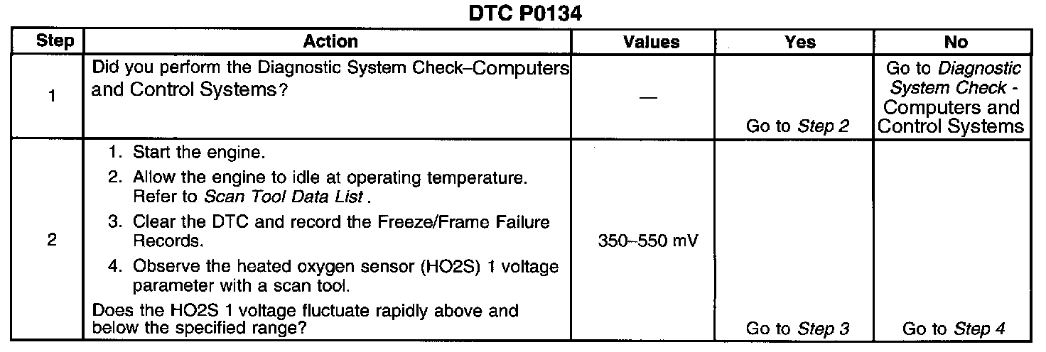 Heated oxygen sensors (HO2S) are used for fuel control and post catalyst monitoring. Each HO2S compares the oxygen content of the surrounding air with the oxygen content of the exhaust stream. When the vehicle is first started the powertrain control module (PCM) operates in an Open Loop mode, ignoring the HO2S signal voltage when calculating the air-to-fuel ratio. The PCM supplies the HO2S with a reference, or bias, voltage of about 450 mV. The HO2S generates a voltage within a range of 0-1,000 mV that fluctuates above and below bias voltage once in Closed Loop. A high HO2S voltage output indicates a rich fuel mixture. A low HO2S voltage output indicates a lean mixture. Heating elements inside the HO2S minimize the time required for the sensors to reach operating temperature, and to provide an accurate voltage signal. It the PCM detects that the HO2S 1 voltage remains at or near the bias voltage amount, DTC P0134 will set.