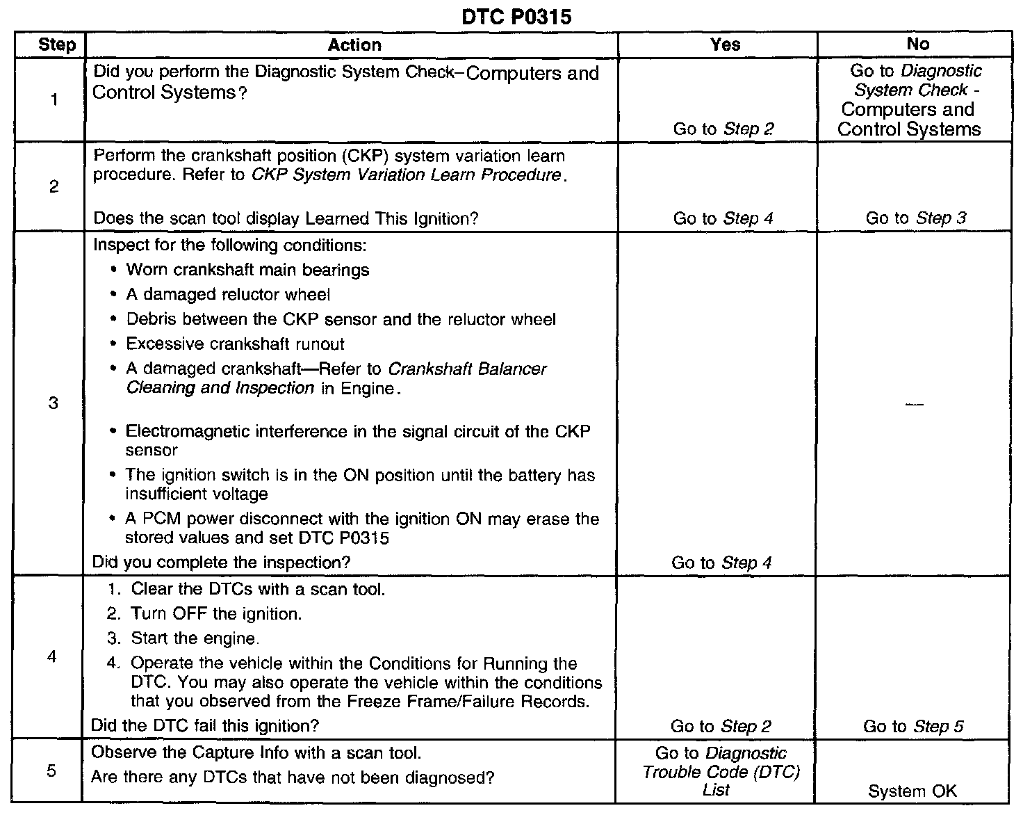 The PCM stores the CKP system variation values after a learn procedure has been performed. If the actual CKP variation is not within CKP system variation compensating values stored in the PCM the DTC may set. If the CKP system variation values are not stored in the PCM memory, DTC P0315 sets.