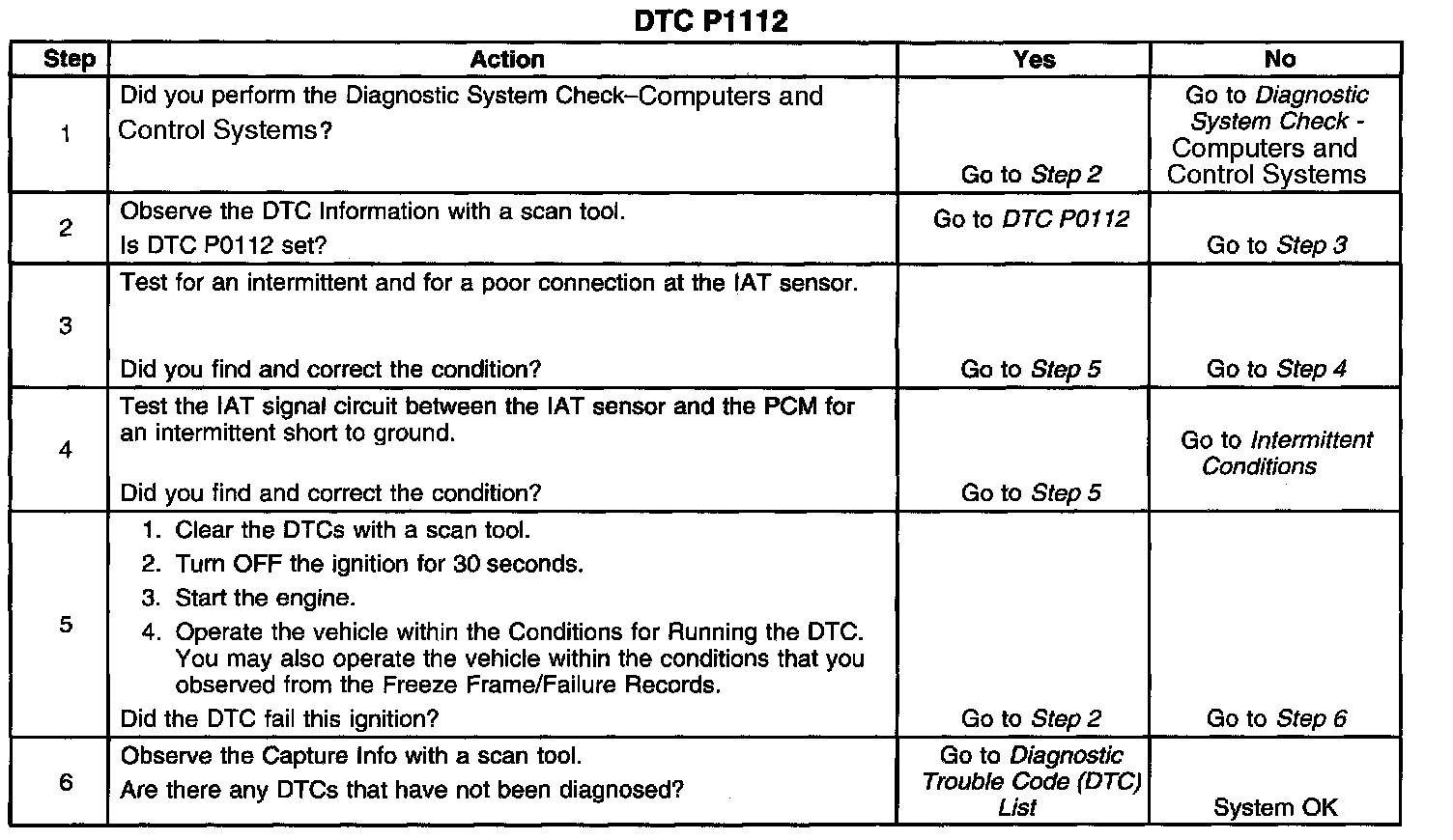 The intake air temperature (IAT) sensor is a variable resistor. The IAT sensor has a signal circuit and a low reference circuit. The IAT sensor measures the temperature of the air entering the engine. The powertrain control module (PCM) supplies 5 volts to the IAT signal circuit and a ground for the IAT low reference circuit. When the IAT sensor is cold, the sensor resistance is high. When the air temperature increases, the sensor resistance decreases. With high sensor resistance, the PCM detects a high voltage on the IAT signal circuit. With lower sensor resistance, the PCM detects a lower voltage on the IAT signal circuit. If the PCM detects an intermittent low IAT signal voltage, indicating a high temperature, DTC P1112 sets.