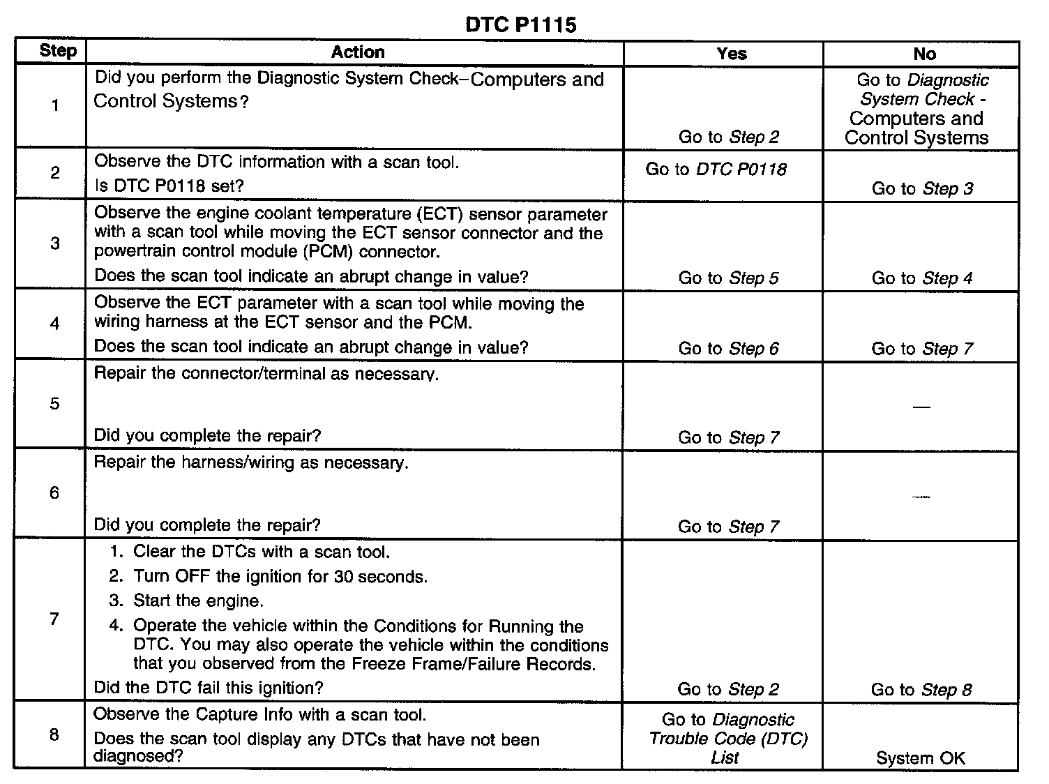 The engine coolant temperature (ECT) sensor is a variable resistor, that measures the temperature of the engine coolant. The powertrain control module (PCM) supplies 5 volts to the ECT signal circuit and a ground for the ECT low reference circuit. When the ECT is cold, the sensor resistance is high. When the ECT increases, the sensor resistance decreases. With high sensor resistance, the PCM detects a high voltage on the ECT signal circuit. With lower sensor resistance, the PCM detects a lower voltage on the ECT signal circuit. If the PCM detects an excessively high signal voltage, which is a low temperature indication, DTC P1115 sets.
