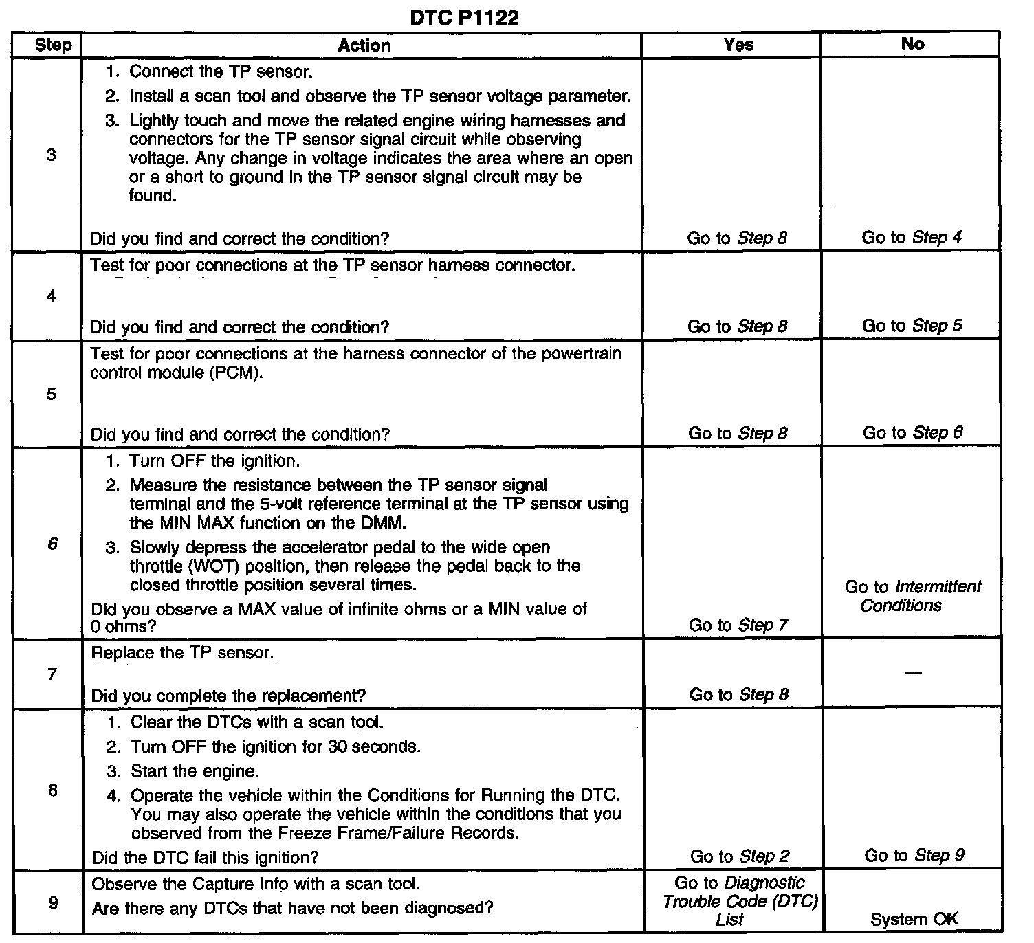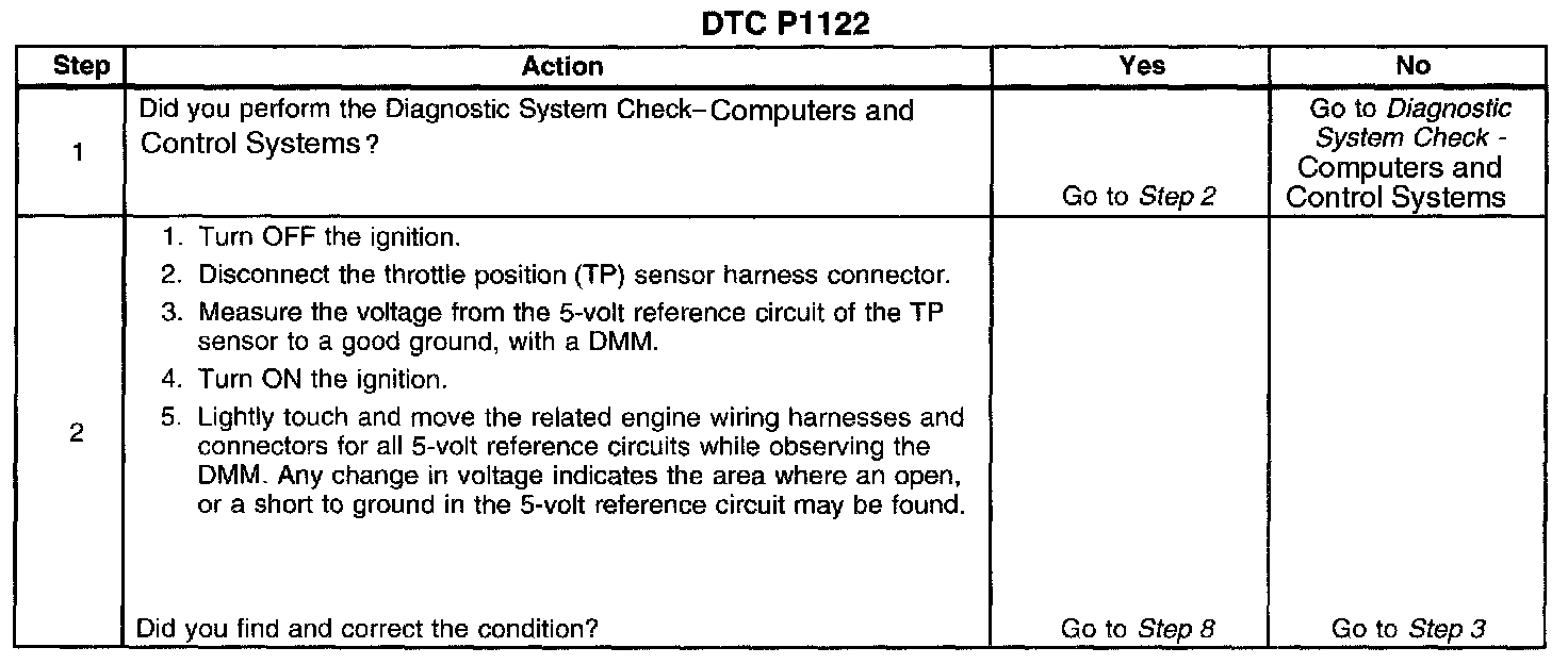 The PCM provides the TP sensor with 5 volts on the 5-volt reference circuit and a ground on the low reference circuit. Rotation of the TP sensor rotor from the closed throttle position to the wide open throttle (WOT) position provides the PCM with a signal voltage from below 1 volt to greater than 4 volts through the TP sensor signal circuit. If the PCM detects an intermittent excessively low signal voltage, DTC P1122 sets.