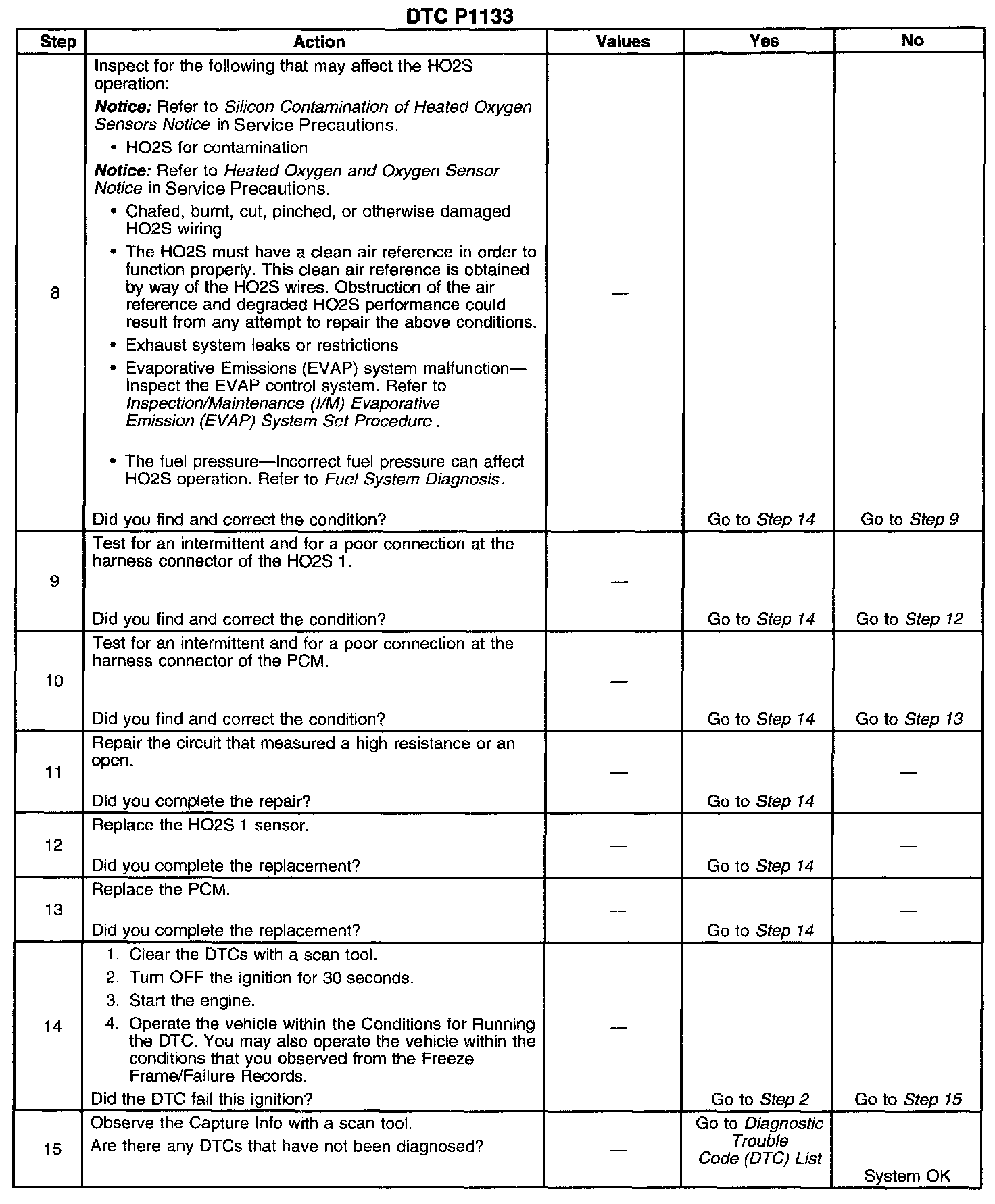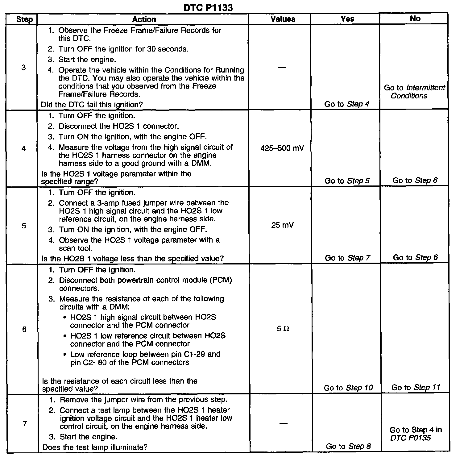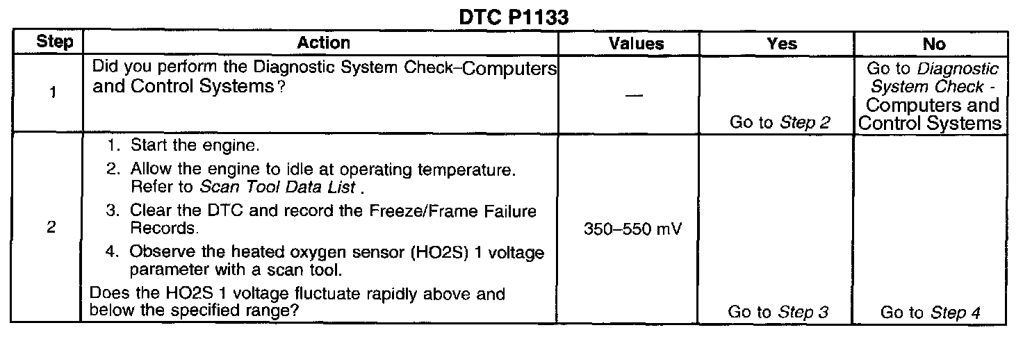 Heated oxygen sensors (HO2S) are used for fuel control and post catalyst monitoring. Each HO2S compares the oxygen content of the surrounding air with the oxygen content of the exhaust stream. When the vehicle is first started the powertrain control module (PCM) operates in an Open Loop mode, ignoring the HO2S signal voltage when calculating the air-to-fuel ratio. The PCM supplies the HO2S with a reference, or bias, voltage of about 450 mV. The HO2S generates a voltage within a range of 0-1,000 mV that fluctuates above and below bias voltage once in Closed Loop. A high HO2S voltage output indicates a rich fuel mixture. A low HO2S voltage output indicates a lean mixture. Heating elements inside the HO2S minimize the time required for the sensors to reach operating temperature, and to provide an accurate voltage signal. If the PCM detects that the HO2S 1 voltage did not switch enough times during a calibrated time period, DTC P1133 will set.