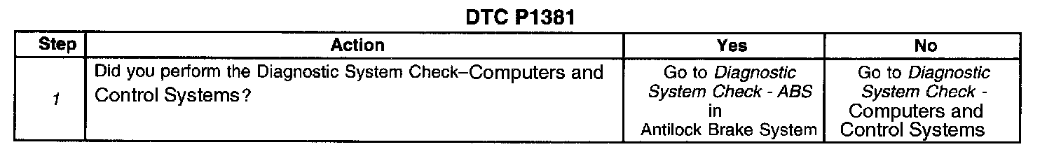The powertrain control module (PCM) detects engine misfire events by monitoring variations in the crankshaft rotation speed. Wheel speed changes caused by rough road conditions can cause changes in crankshaft rotation speed. By monitoring the wheel speed sensors, the anti-lock brake system (ABS) can determine if the vehicle is operating on a rough road. If the ABS is detecting a rough road condition severe enough to effect misfire detection, a rough road signal is sent to the PCM on the serial data circuit. If DTC P0300 is set and the rough road information is not available due to an ABS malfunction or a serial data malfunction, DTC P1381 will set.