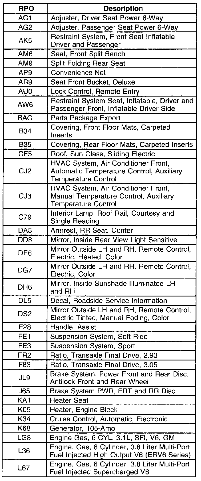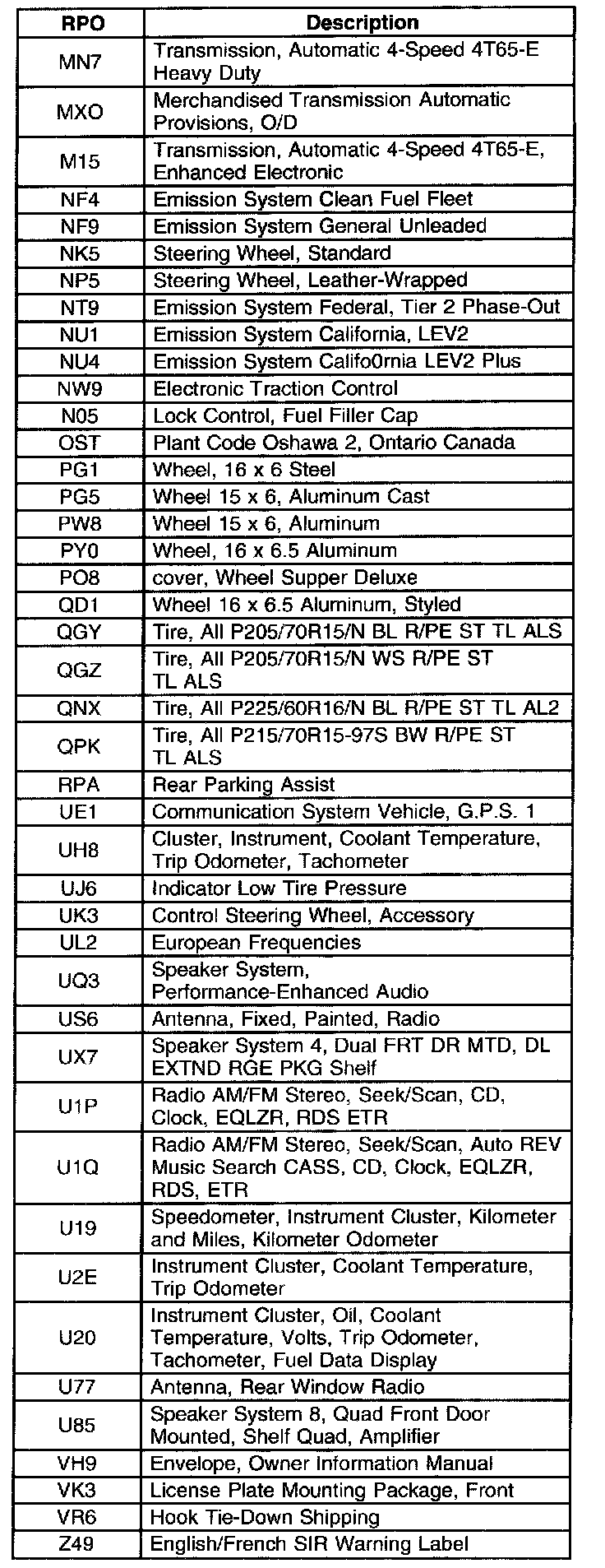 The table provides the description of the Regular Production Option (RPO) codes that are available on the vehicle. The vehicle's RPO list is printed on the Service Parts Identification Label.