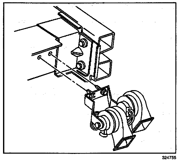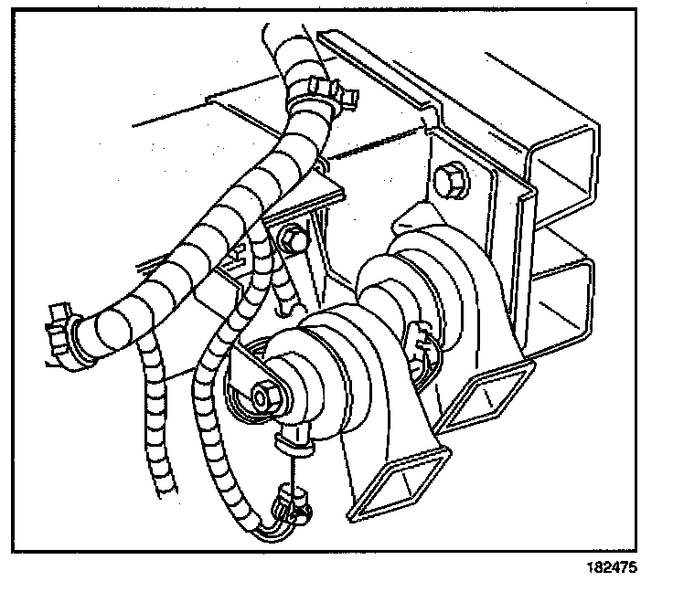 1. Position the horn assembly to the frame rail extension. Insert the horn anti-rotation tab into the slot on the frame rail.