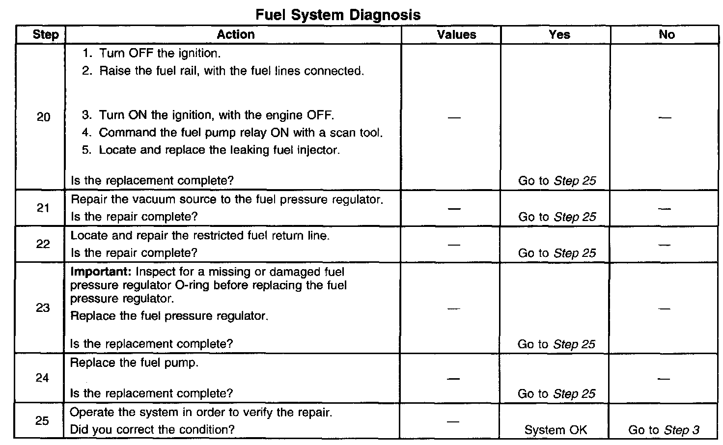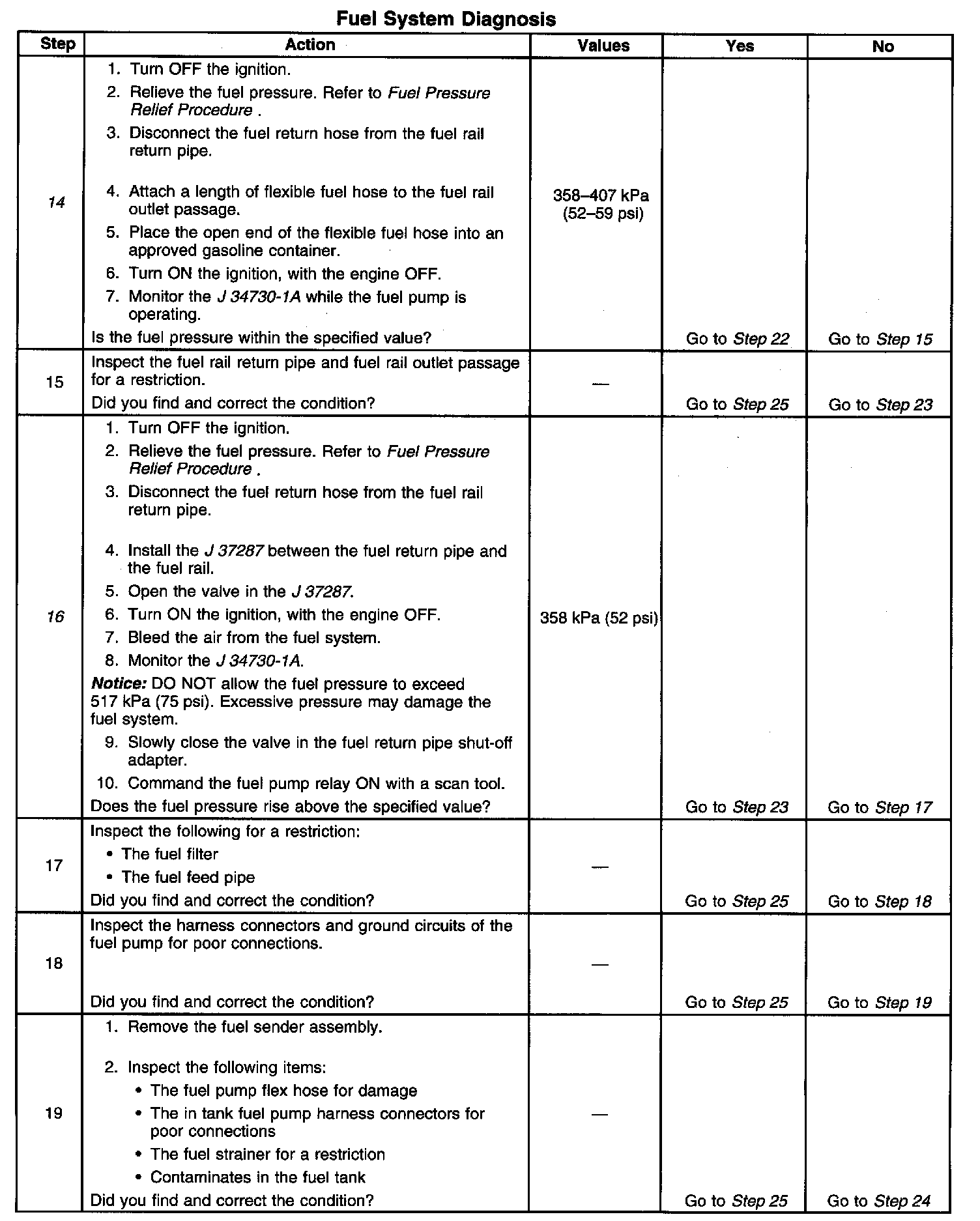 14. This step tests for a restricted fuel return pipe. If the fuel pressure is within the specified values, a restriction in the fuel return pipe is indicated.