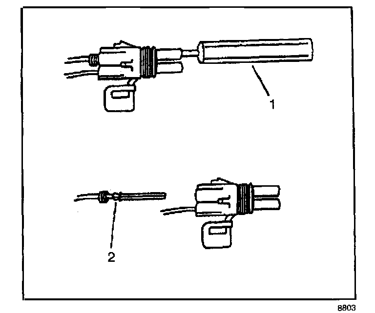 4. Insert the Weather Pack(R) terminal removal tool into the front (mating end) of the connector cavity until it rests on the cavity shoulder (1).