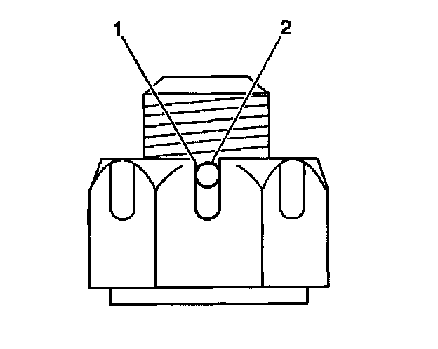 5. If necessary, tighten the ball stud castle nut in order to align the ball stud castle nut slot (1) to the ball stud cotter pin hole (2) as shown.