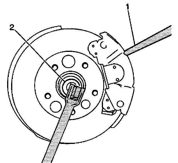 4. Remove the front wheel drive shaft nut (2). Insert a drift or a flat-bladed tool (1) into the caliper and the rotor to prevent the rotor from turning.
