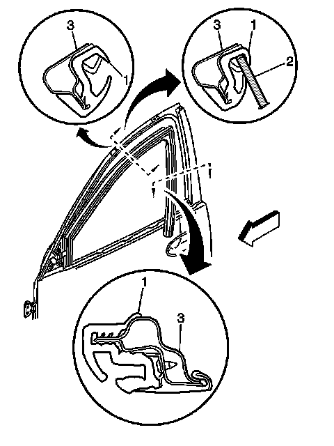 4. Remove the front door outer belt sealing strip. Refer to Sealing Strip Replacement - Front Door Window Belt Outer - Front (Front Side Door Window Belt Inner Sealing Strip Replacement) .