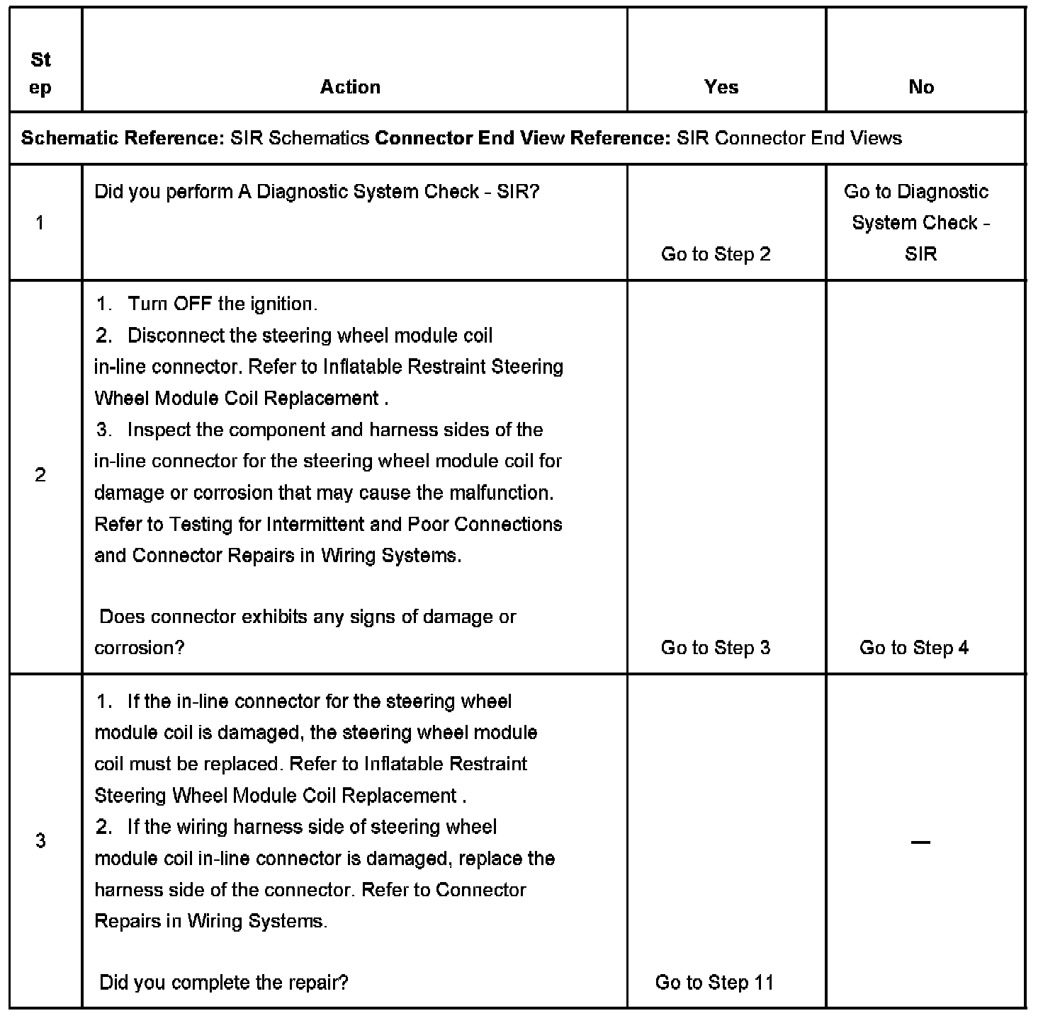 There are 2 shorting bars used within the steering wheel module coil connector which will short together both steering wheel module stage 1 high circuit and steering wheel module stage 1low circuit and both steering wheel module stage 2 high circuit and steering wheel module stage 2 low circuit when the connector is disconnected, this will help to prevent unwanted deployment of the inflator module during servicing. During a frontal crash of sufficient force the inflatable restraint sensing and diagnostic module (SDM) will allow current to flow through the deployment loop in order to deploy the steering wheel module. The SDM performs continuous diagnostic tests on the deployment loops to check for proper circuit continuity and for shorts to ground or voltage. If a malfunction is detected, a diagnostic trouble code (DTC) will be stored in memory.