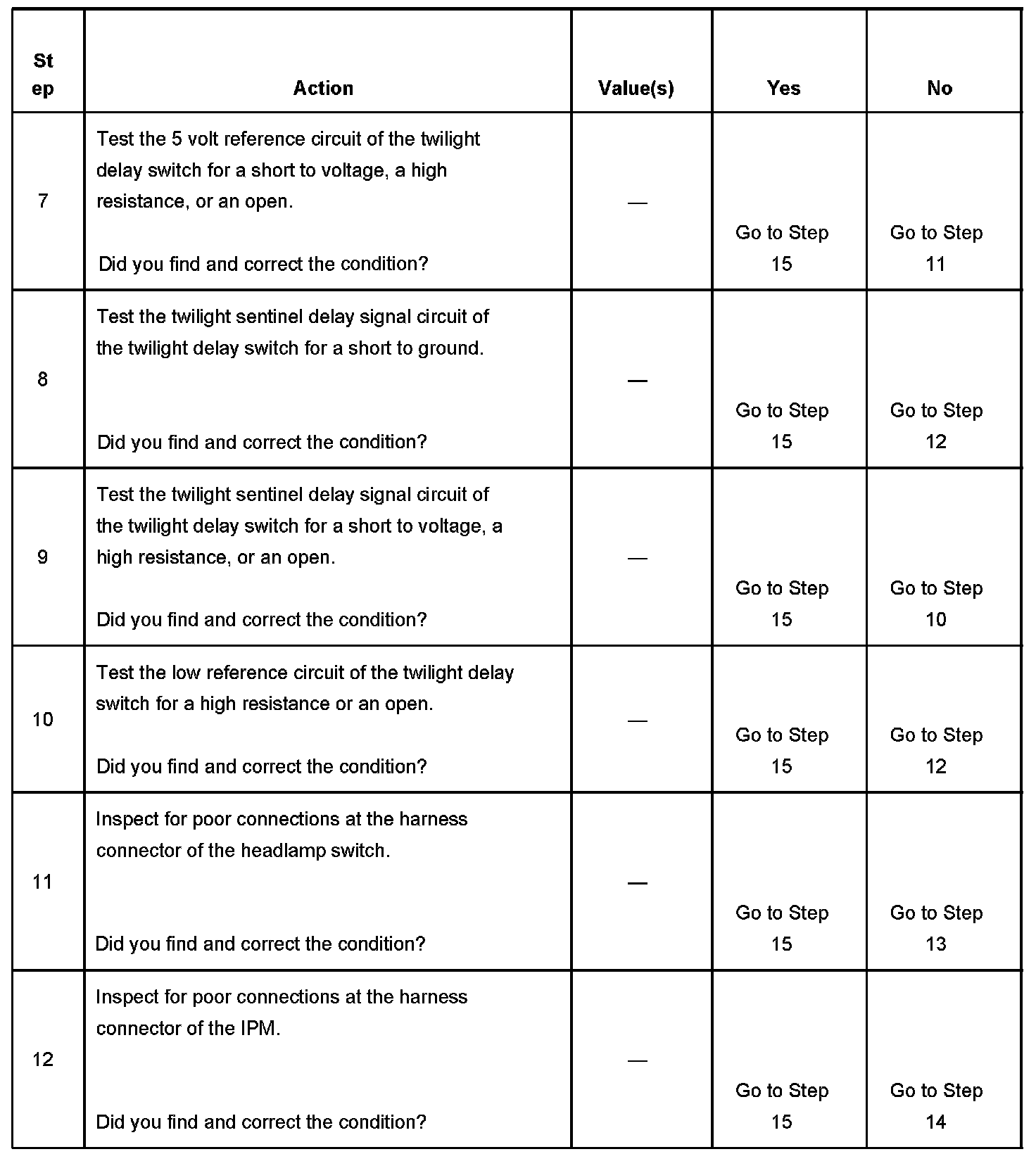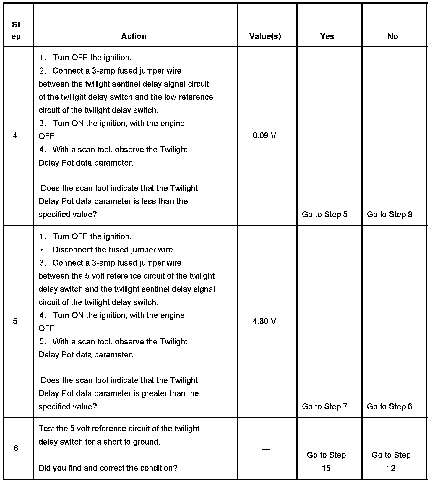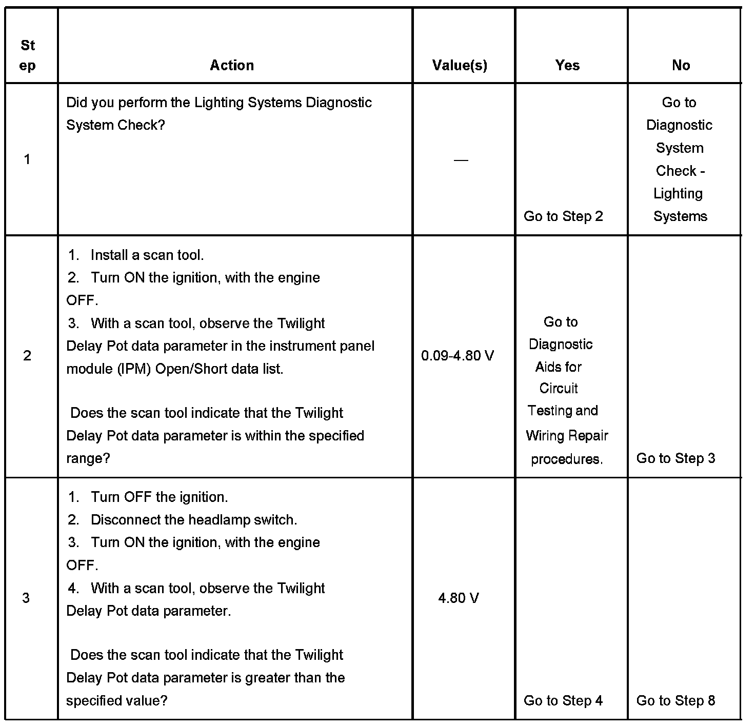 The twilight delay switch is a potentiometer. The instrument panel module (IPM) determines the control setting based on the voltage from the twilight delay switch. The IPM module sends out a class 2 message to the dash integration module (DIM).