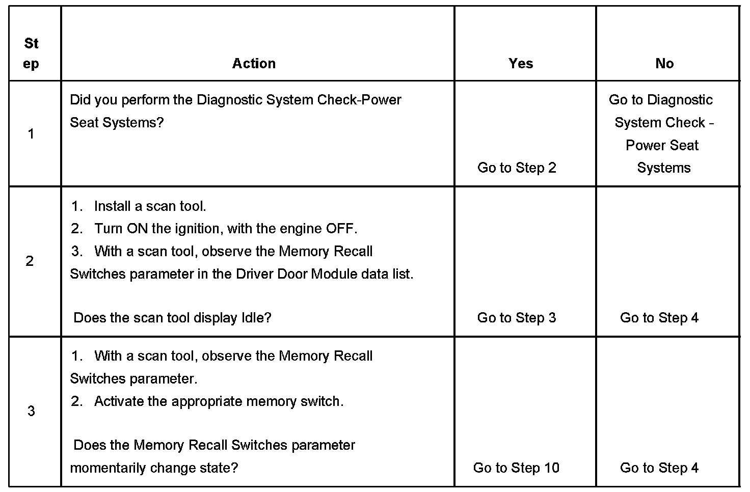 The memory function switches are normally open and are wired to the driver door switch assembly (DDSA). When a memory recall switch is pressed, the switch pulls the 5 volt circuit from the DDSA low. The DDSA senses that a memory recall signal was pulled low and a class 2 message is sent out identifying that the circuit is active.