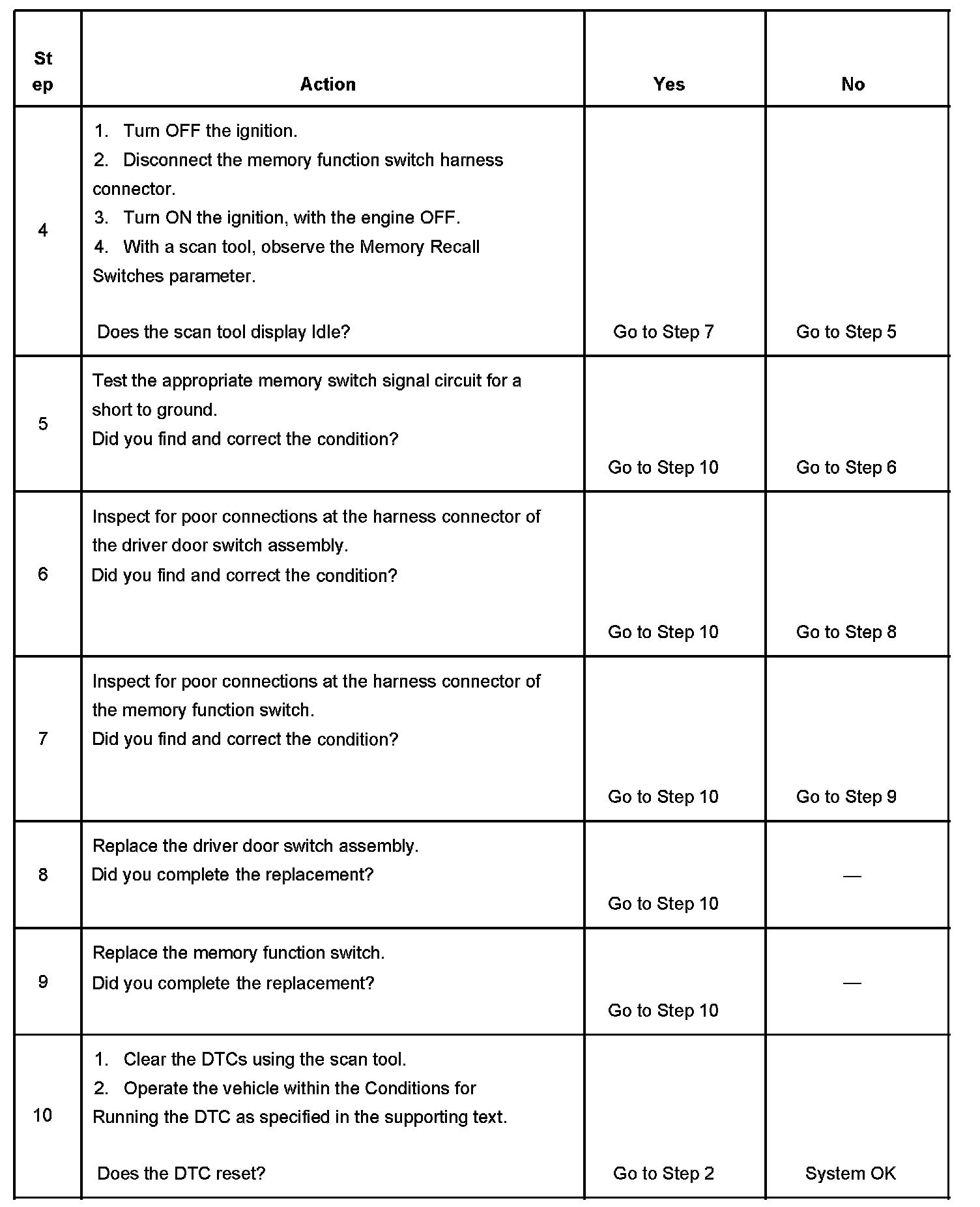 If a memory recall switch circuit is active for more than 30 continuous seconds, the circuit will be considered shorted, and the DDSA will set this DTC.