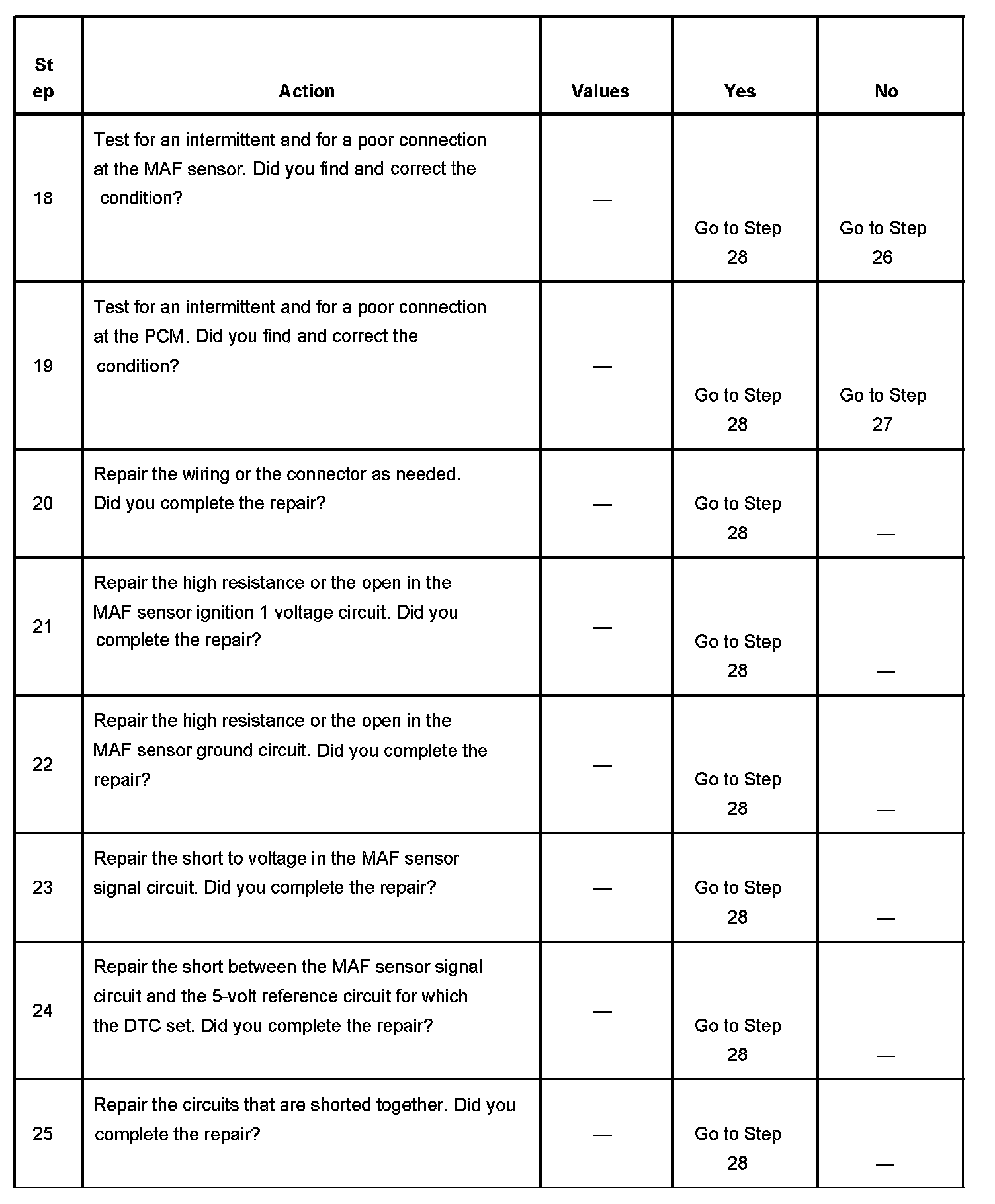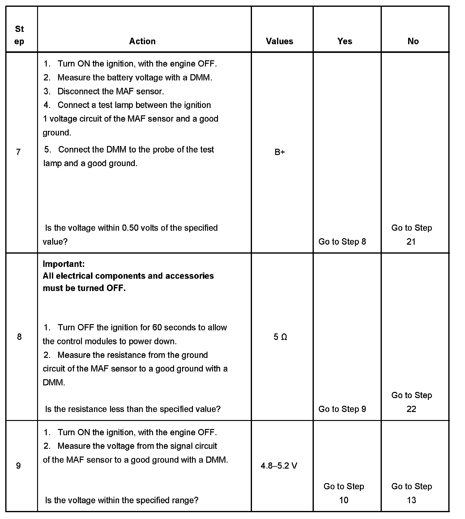 10. This step tests the signal circuit of the MAF sensor for a short to another 5-volt reference circuit.