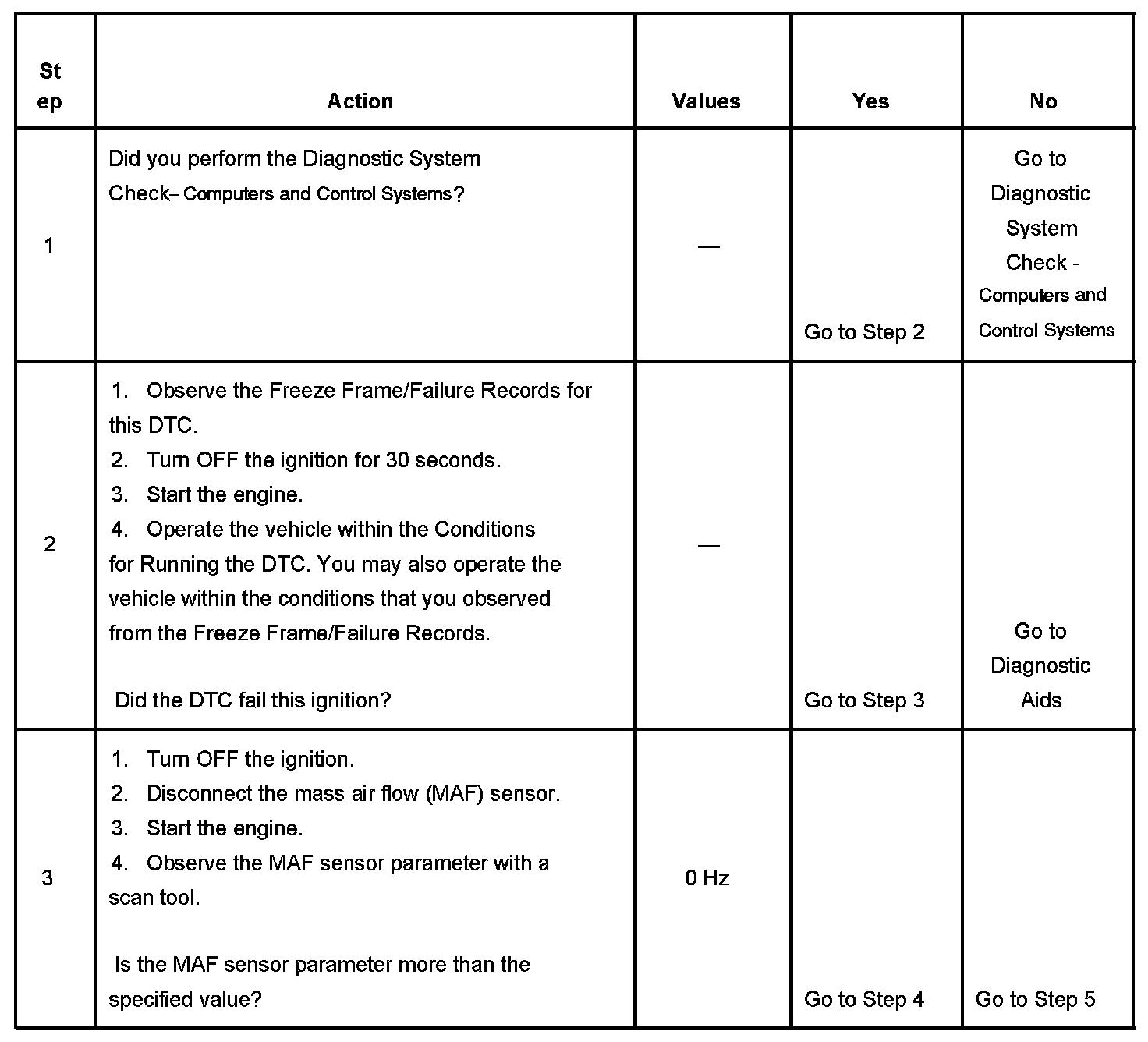 3. This step tests for Electromagnetic Interference (EMI) on the signal circuit of the MAF sensor. A frequency reading with the MAF sensor disconnected may indicate an EMI related fault or a poor connection at the PCM. Disconnecting the MAF sensor may set additional related DTCs.