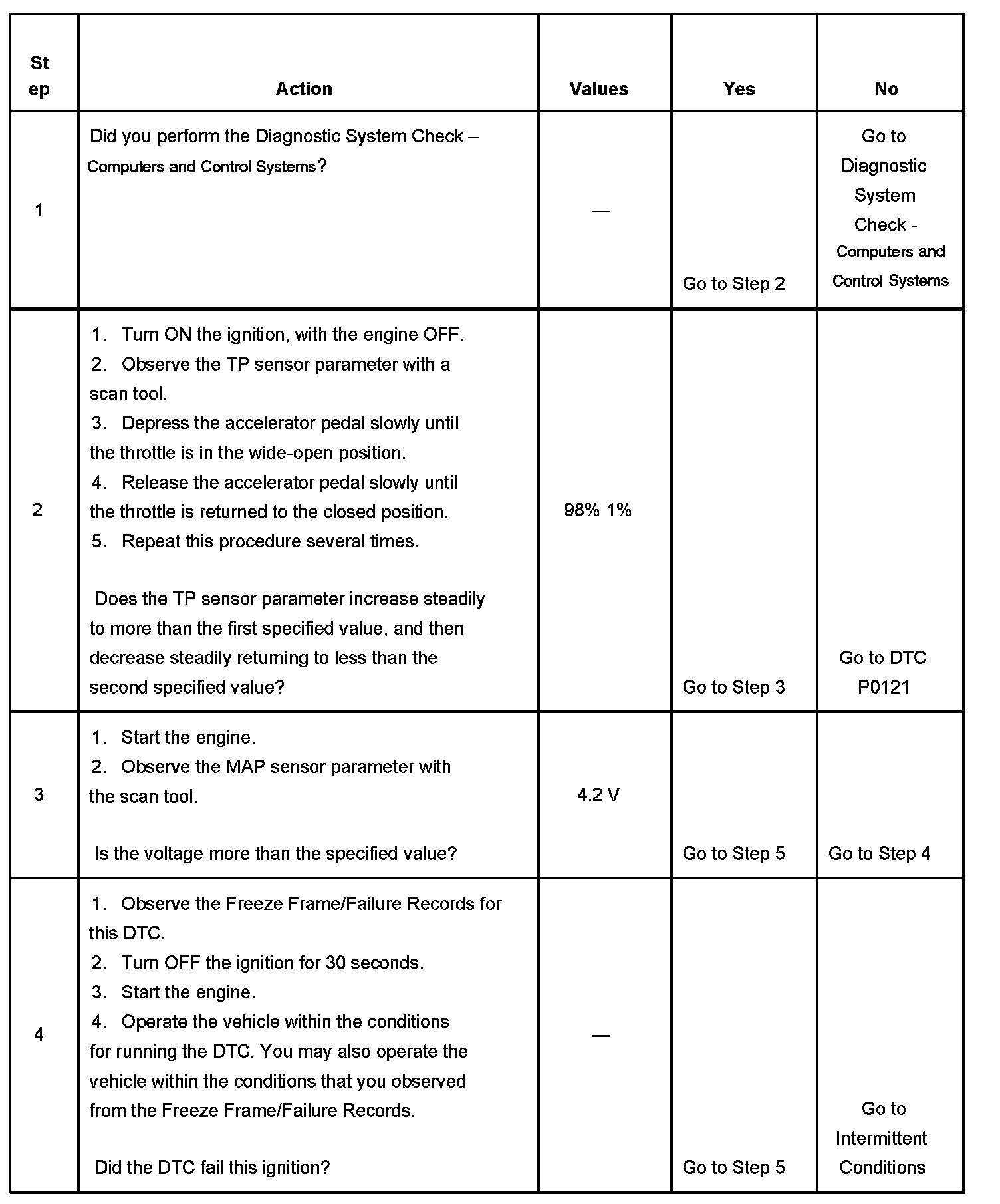 The PCM detects that the MAP sensor signal voltage is more than 4.2 volts for 7 seconds.