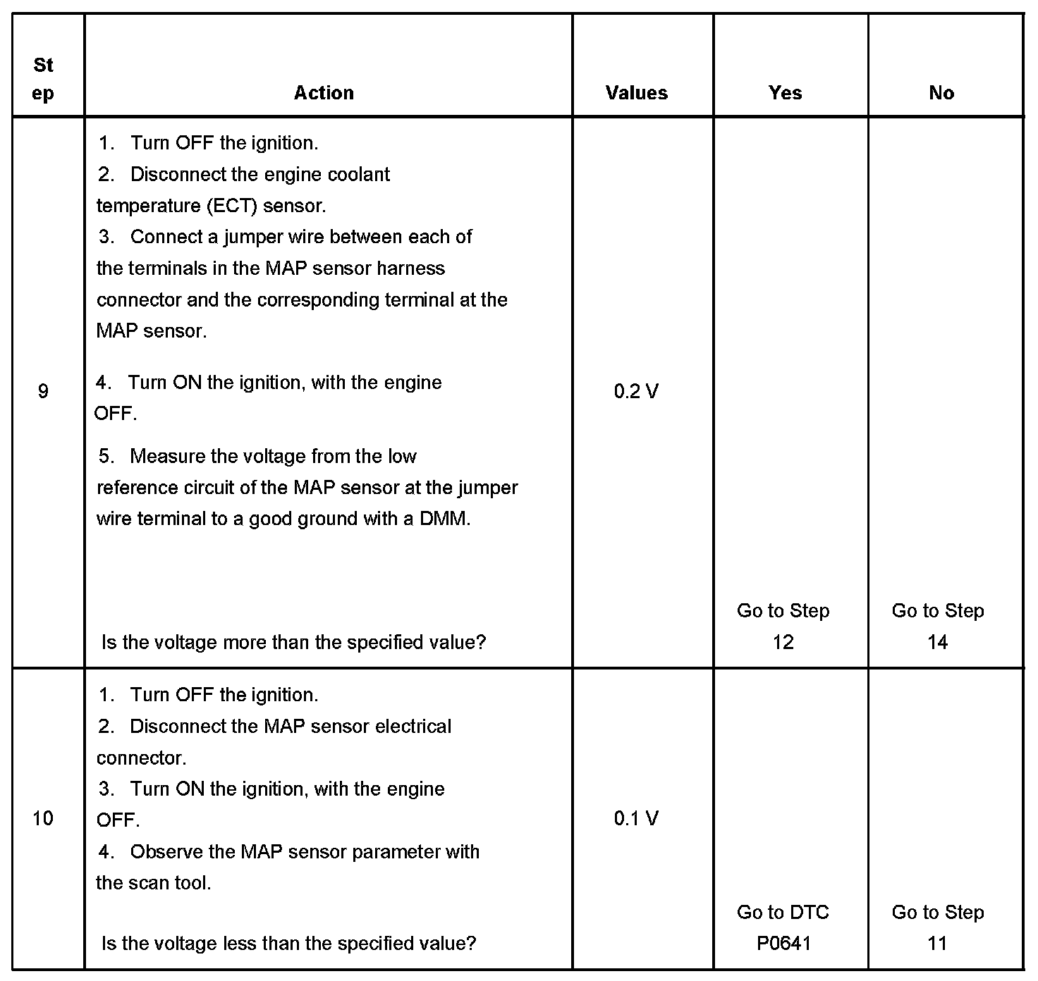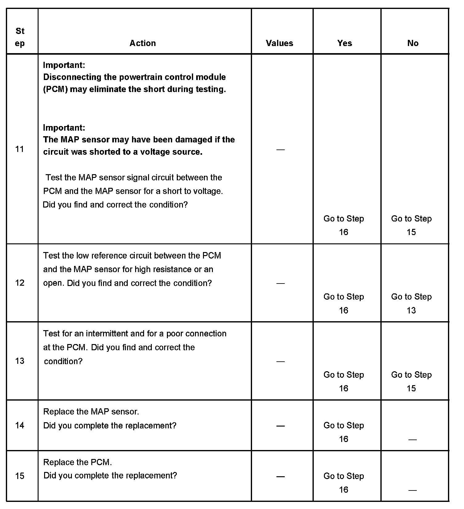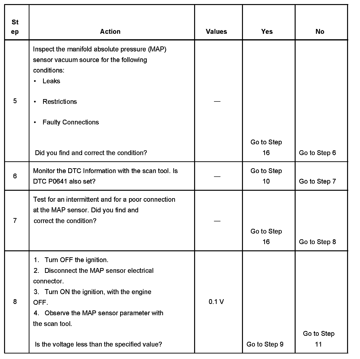 The powertrain control module (PCM) supplies 5 volts to the MAP sensor on the 5-volt reference circuit. The PCM also provides a ground on the low reference circuit. The MAP sensor provides a signal to the PCM on the MAP sensor signal circuit which is relative to the pressure changes in the manifold. The PCM should detect a low signal voltage at a low MAP, such as an idle or a deceleration. The PCM should detect a high voltage at a high MAP, such as the ignition is ON with the engine OFF, or at wide open throttle (WOT). The MAP sensor is also used in order to determine the barometric pressure (BARO). This occurs when the ignition switch is turned ON, with the engine OFF. The BARO reading may also be updated whenever the engine is operated at WOT. The PCM monitors the MAP sensor signal for voltage outside of the normal range. If the PCM detects a MAP sensor signal voltage that is excessively low, DTC P0108 sets.