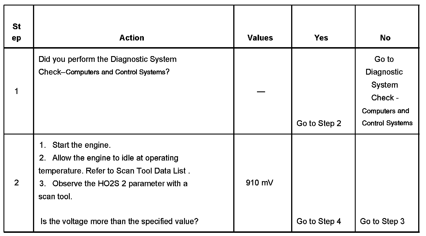 The PCM detects that the HO2S 2 voltage is more than 910 mV, for more than 2 minutes during Closed Loop operation.