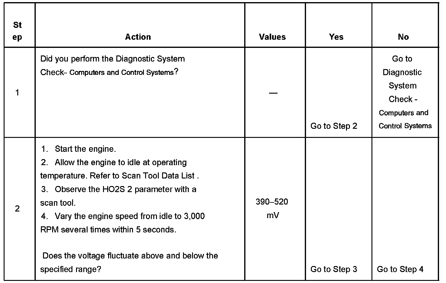 The PCM detects that the HO2S 2 signal voltage remains between 390-520 mV for more than 100 seconds.