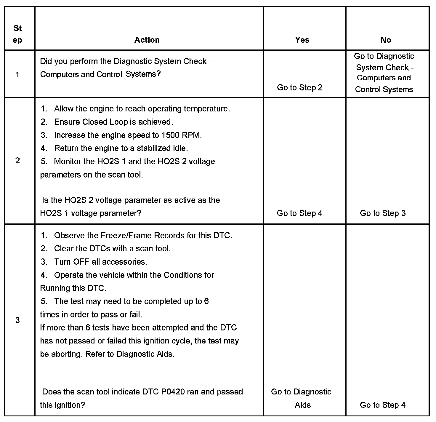 A three-way catalytic (TWC) converter controls emissions of hydrocarbons (HC), carbon monoxide (CO), and oxides of nitrogen (NOx). The catalyst within the converter promotes a chemical reaction which oxidizes the HC and the CO that are present in the exhaust gas. This process converts the HC and the CO into water vapor and carbon dioxide (CO2), and reduces the NOx, converting the NOx into nitrogen. The catalytic converter also stores oxygen. The powertrain control module (PCM) monitors this process by using a heated oxygen sensor (HO2S) that is in the exhaust stream after the TWC. This HO2S 2, also referred to as the catalyst monitor sensor, produces an output signal that the PCM uses to calculate the oxygen storage capacity of the catalyst. This indicates the ability of the catalyst to convert the exhaust emissions efficiently. The PCM monitors the efficiency of the catalyst by allowing the catalyst to heat, then wait for a stabilization period while the engine is idling. The PCM then adds and removes fuel while monitoring the HO2S 2. When the catalyst is functioning properly, the HO2S 2 response to the extra fuel is slow compared to the response of the HO2S 1, which is located before the TWC. When the HO2S 2 response is near that of the HO2S 1, the oxygen storage capability and efficiency of the catalyst may be degraded below an acceptable threshold. If the PCM detects the degraded condition, DTC P0420 sets.