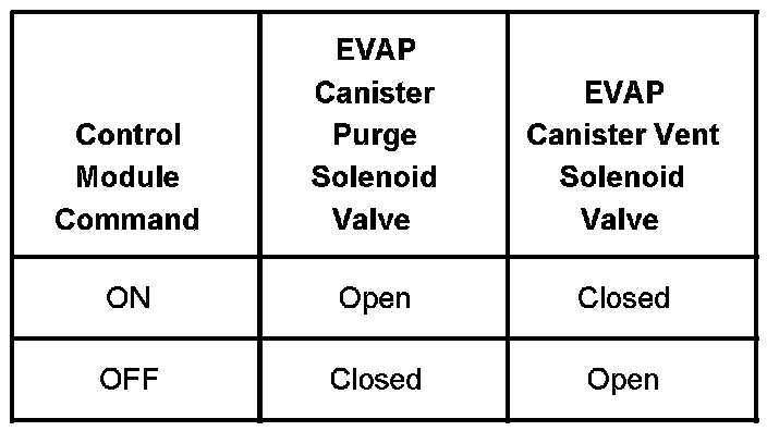 The table illustrates the relationship between the ON and OFF states, and the OPEN or CLOSED states of the EVAP canister purge and solenoid vent valves.