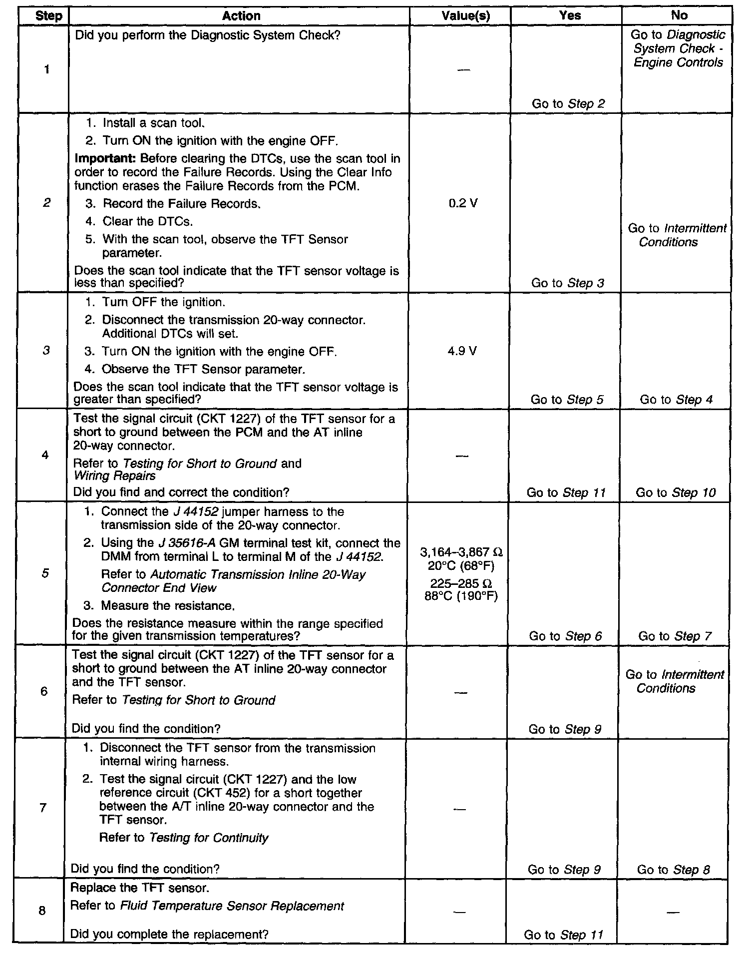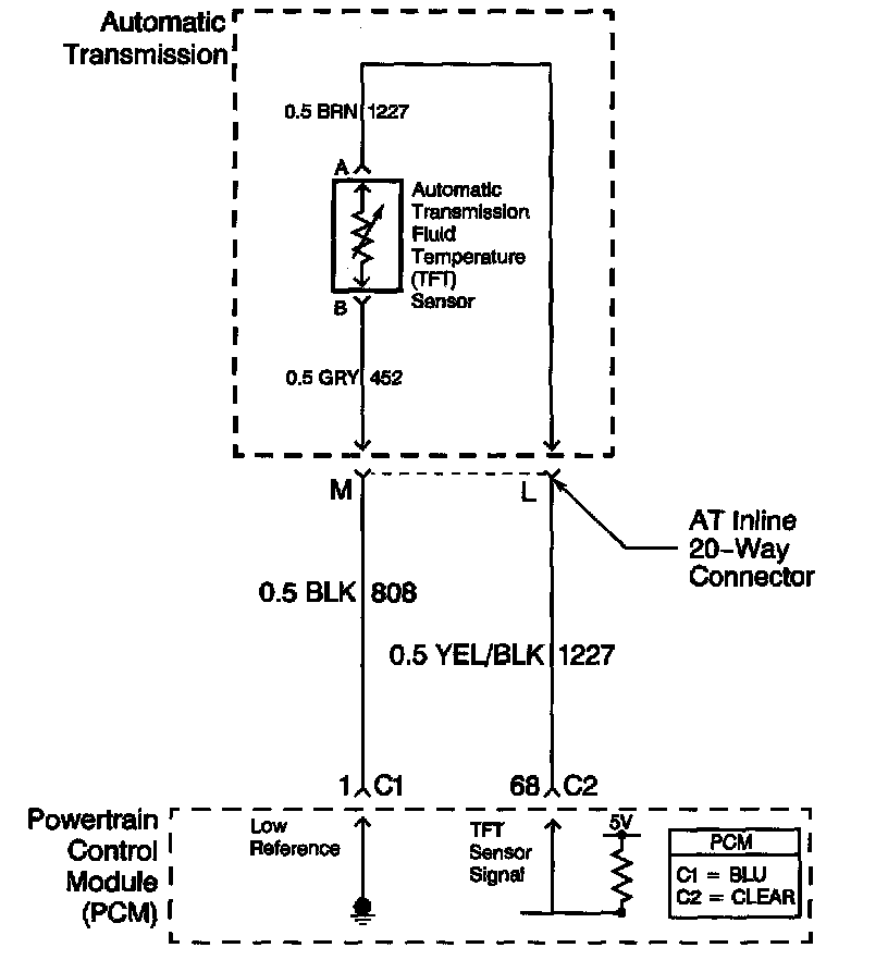 The automatic transmission fluid temperature (TFT) sensor is a negative coefficient thermistor whose resistance value changes based on temperature. The PCM provides a 5 volt reference to the sensor circuit. A high fluid temperature or a short to ground on the signal circuit results in low signal voltage. The TFT sensor operating range is -40 to +151°C (-40 to +304°F).