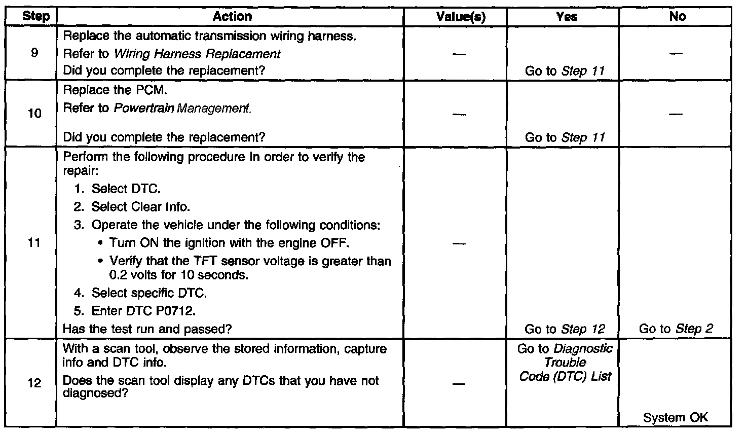 If the PCM detects a continuous short to ground in the TFT sensor signal circuit, then DTC P0712 sets. DTC P0712 is a type C DTC.
