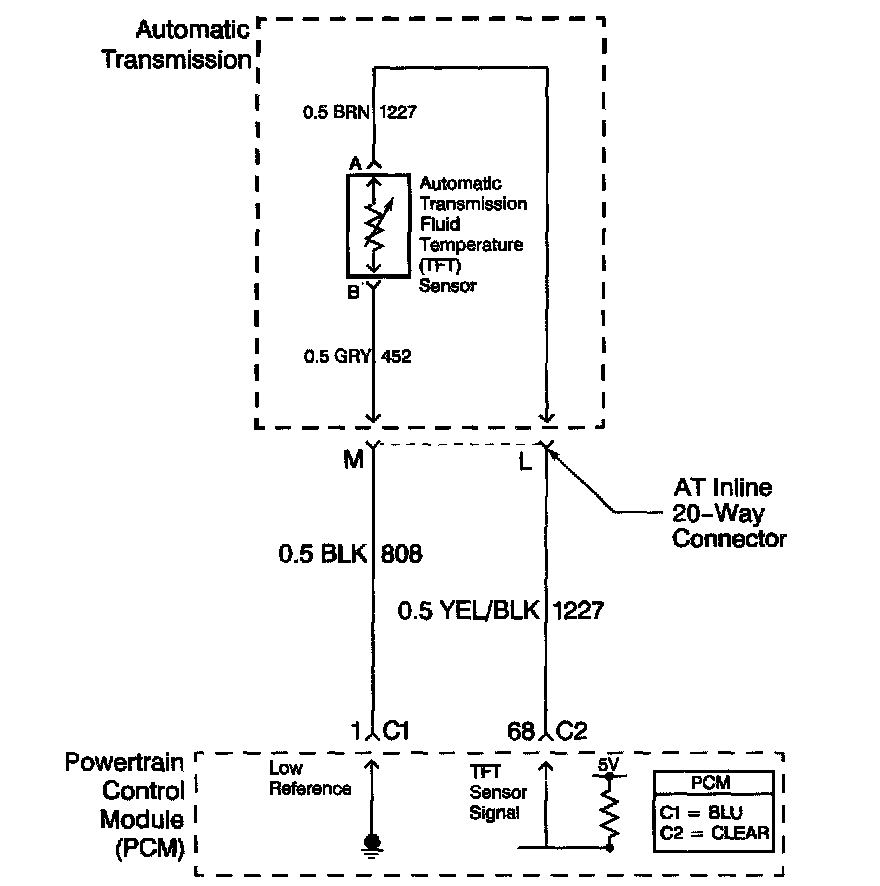 The automatic transmission fluid temperature (TFT) sensor is a negative coefficient thermistor whose resistance value changes based on temperature. The PCM provides a 5 volt reference to the sensor. A low fluid temperature, an open TFT sensor or sensor circuit results in high signal voltage. The TFT operating range is -40 to +151°C (-40 to +304°F).