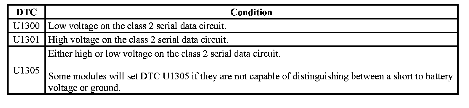 Modules connected to the class 2 serial data circuit monitor for serial data communications during normal vehicle operation. Operating information and commands are exchanged among the modules. In addition to this, Node Alive messages are transmitted by each module on the class 2 serial data circuit about once every 2 seconds. When the module detects one of the following conditions on the class 2 serial data circuit for approximately 3 seconds, the setting of all other class 2 serial communication DTCs is inhibited and a DTC will set.