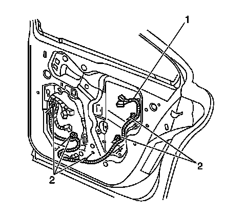 7. Install the door wiring harness clips (2) to the inner door panel.
