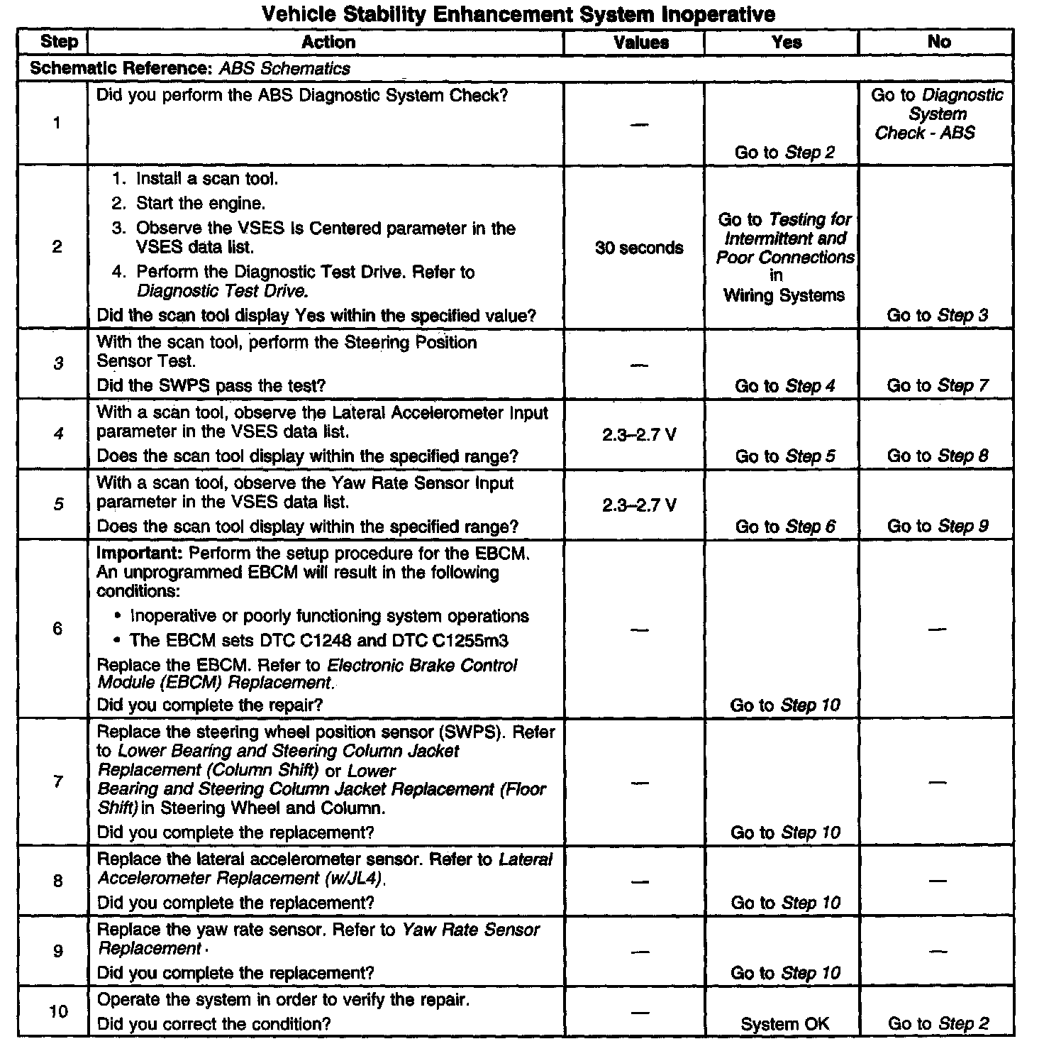 Steer angle centering is the process by which the EBCM calibrates the steering sensor output so that the output reads zero when the steering wheel is centered. Using the yaw rate input, lateral accelerometer input, and wheel speed sensor inputs, the initial steering center position is calculated after driving greater than 10 km/h (6 mph) for more than 10 seconds in a straight line on a level surface.