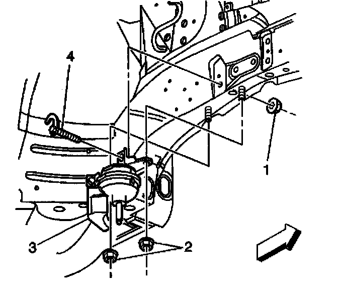 6. Remove the two nuts (2) securing the mount to the body frame rail.